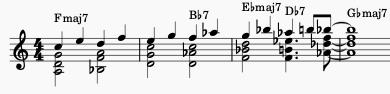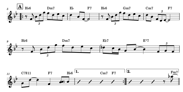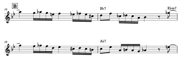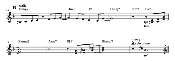 The second part, B, of the tune, is presented in contrast with the first one, giving linear and singable phrases to the melody, always following a simple cadence concept in the harmony, but going away from the key center of C major by minor thirds, to Eb major and Gb major. After that, the tune goes back to A section, to which solos follow on the structure chord progression.