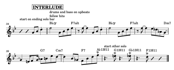 Between the solos, we have a very peculiar INTERLUDE (2:17-2:34), played by the whole band, which gives us a breath and a clear distinction between the soloists by giving a pedal break, to which follows another 4-bar section filled with language lines, altered chords and syncopated hits, where vibraphone can be heard as one of the main voices and most “cutting-through” instruments, making it, once again, another very important element.