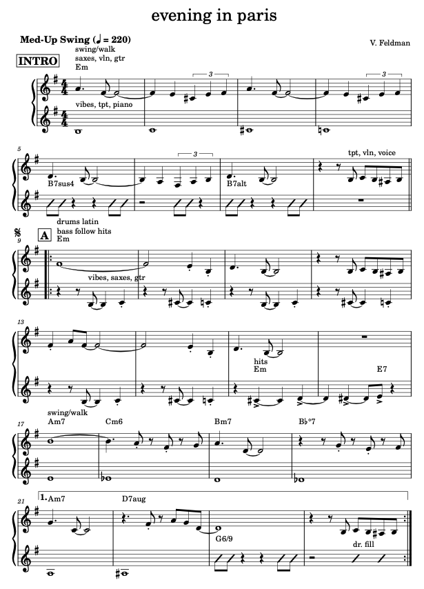The second composition that we will analyze is called “Evening in Paris” [3]. This song, as the title of the album “Vic Feldman On Vibes” suggests, finally presents Feldman entirely playing on the vibraphone.