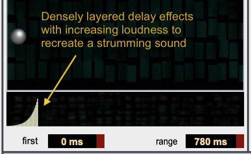 The GRM Tools Classic audio plugins were the main tool used to simulate unusual strumming sounds using densely layered delay effects. The Shuffling and Freeze plugins from this package were used to create a similar relationship with the pitched and unpitched tapping sounds that unify Section 1. The pitched tapping consists of quickly repeating notes that first fade in around 0:18. As with the strumming effect from the opening, an actual guitar recording is used as source material, and the finger tapping technique is realized with software. A sound recording of myself tapping pitches on the fretboard of an acoustic guitar is processed using the GRM Freeze plugin to create dozens of overlapping looping patterns that gradually move from a single guitar into an ensemble kind of sound with slight variations from the slight use of the randomization parameter in the plugin. The GRM Shuffling plugin can be used for dense granular sounds with minute durations, or as a kind of rhythmically asynchronous looping effect. Starting around 0:36 in the recording, an actual recording of tapping on the wooden body of the acoustic guitar oscillates between acting as a textural device with an ensemble effect consisting of many randomly tapping guitars, later becoming audible as a single pulse.