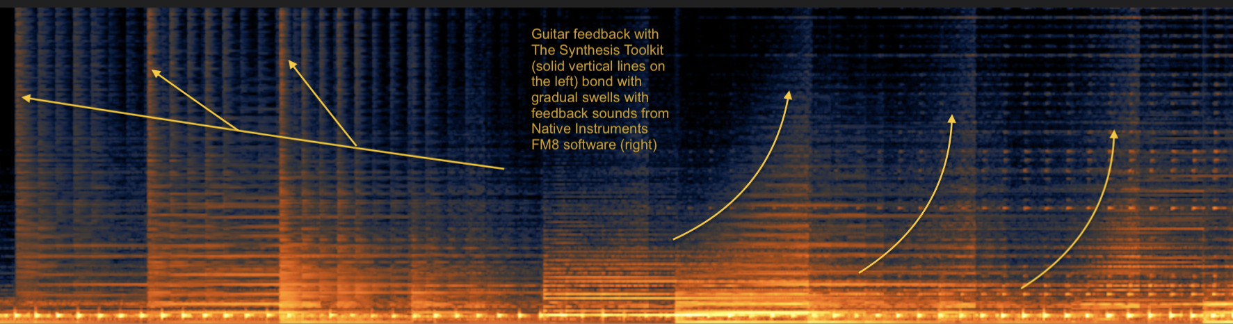 RTcmix is a programming language used for composing algorithmic music. The language includes a software instrument called STRUMFB, which models a plucked string but also offers discrete controls for the pitch of the feedback (separate from the pitch of the string itself) and how present distortion and feedback appear in relation to the string sound. Aside from the technical features or audible artificiality of FM vs. earlier physical modeling approaches, these synthesized guitar noise sources work together strongly to reference a source that is not actually present in many of the recordings that form the piece. This is present at 2:00 in the recording of the piece, where the periodic swells of distorted feedback from FM8 are placed alongside a STRUMFB instrument with less synchronous lower notes and similar feedback sounds that sometimes match the pitch from FM8. Combining different synthesized guitar sounds in this fashion contributes to what Denis Smalley describes as source bonding in electroacoustic music, where there is a "…natural tendency to relate sounds to supposed sources and causes, and to relate sounds to each other because they appear to have shared or associated origins (Smalley 1997).