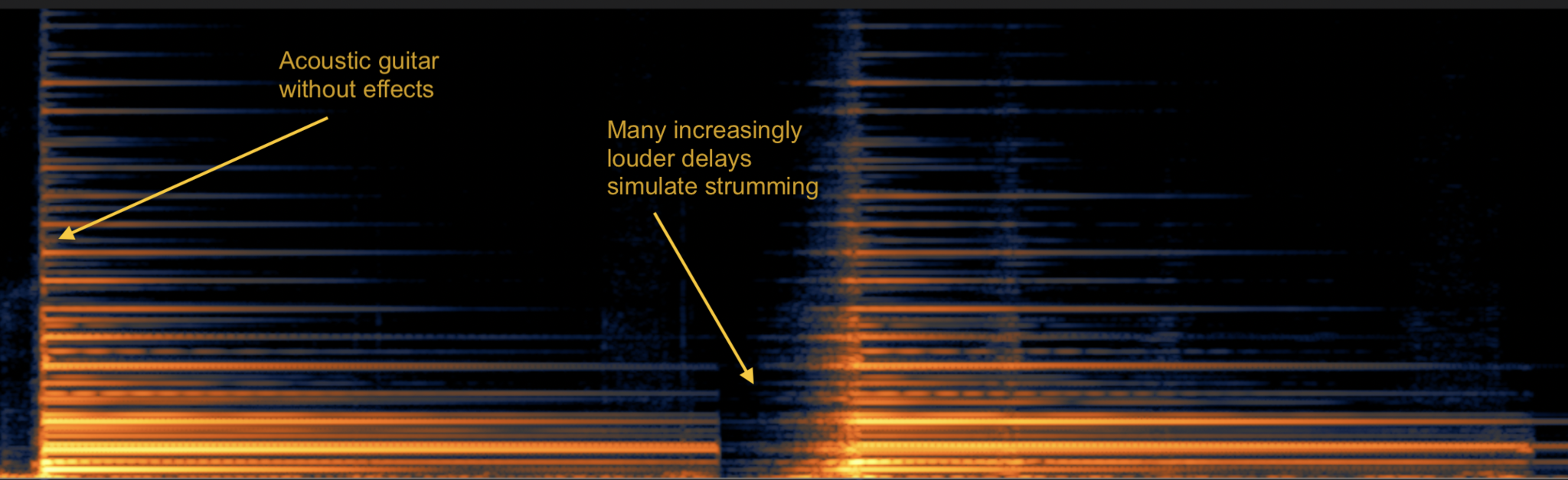 The opening gesture acts as a microcosm for the entire first section. At 0:07 a degraded but recognizable recording of a strummed guitar chord is played. While discernable in terms of pitch, the strumming articulations, the repeated percussive plucking of the strings, is intentionally made to feel artificial. This digital strumming is accomplished with an elaborate delay effect in which fourteen consecutively louder copies of the guitar sound are placed within just over half a second of each other. From 0:00 in the recording, the growth to this initial moment of impact consists of additional elements that shape the next few minutes of the piece: percussive tapping on the sides and top of the guitar, tapping on the fretboard to produce sounds that are pitched yet somewhat percussive, and electronic noises from detaching an instrument cable.