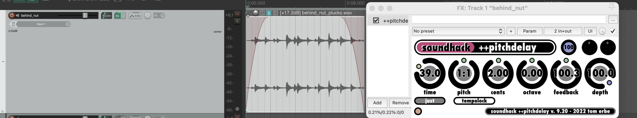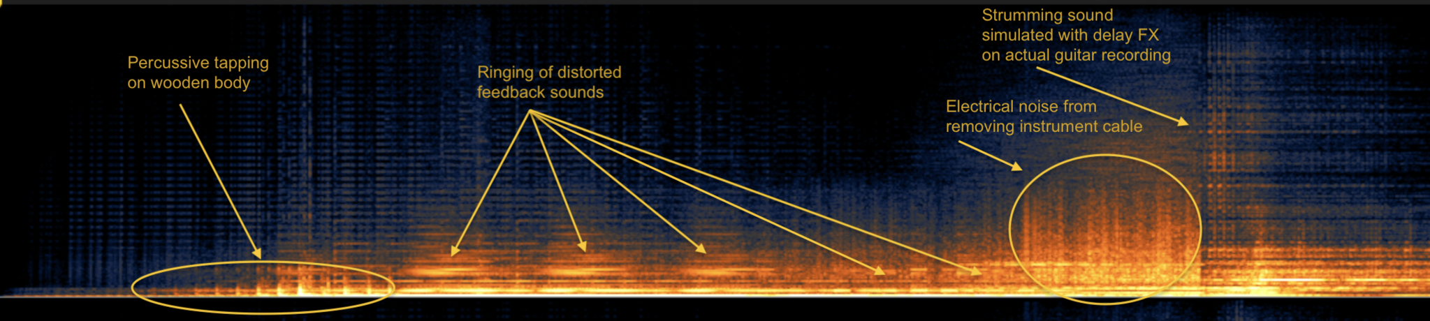 An example of the way in which digital and seemingly acoustic sounds drag each other to assume an overall greater sense of presence can be heard from 3:52-5:04 in the main recording. This is where the music is focused on continuous bursts of gliding gestures made by applying heavy delay and pitch shifting effects to recordings of the strings being plucked close to the tuning pegs. Due to the tension of the strings for this part of the guitar, such an extended technique produces a high-pitched, brittle sound that gives a fair amount of extraneous plectrum noise. As individual sonic events, the recordings of actual plucked sounds and the noisy artifacts from the RAVE plugin are quite distinct in the virtual vs. actual binary, though the gradual coalescence of the many plucked sounds into a dense texture of gliding effects gives the more rhythmic/gestural use of older STK physical models and simulation of tapping/inharmonic guitar sounds in RAVE a greater feeling of performativity in that they become more of a motivic than a textural device at this point. In Obsession, the expression of liveness through digital instrumentality is not only a matter of hearing performative gestures as they occur, but also in the way that simulated sounds continuously converse with authentic recordings to become more-than present.