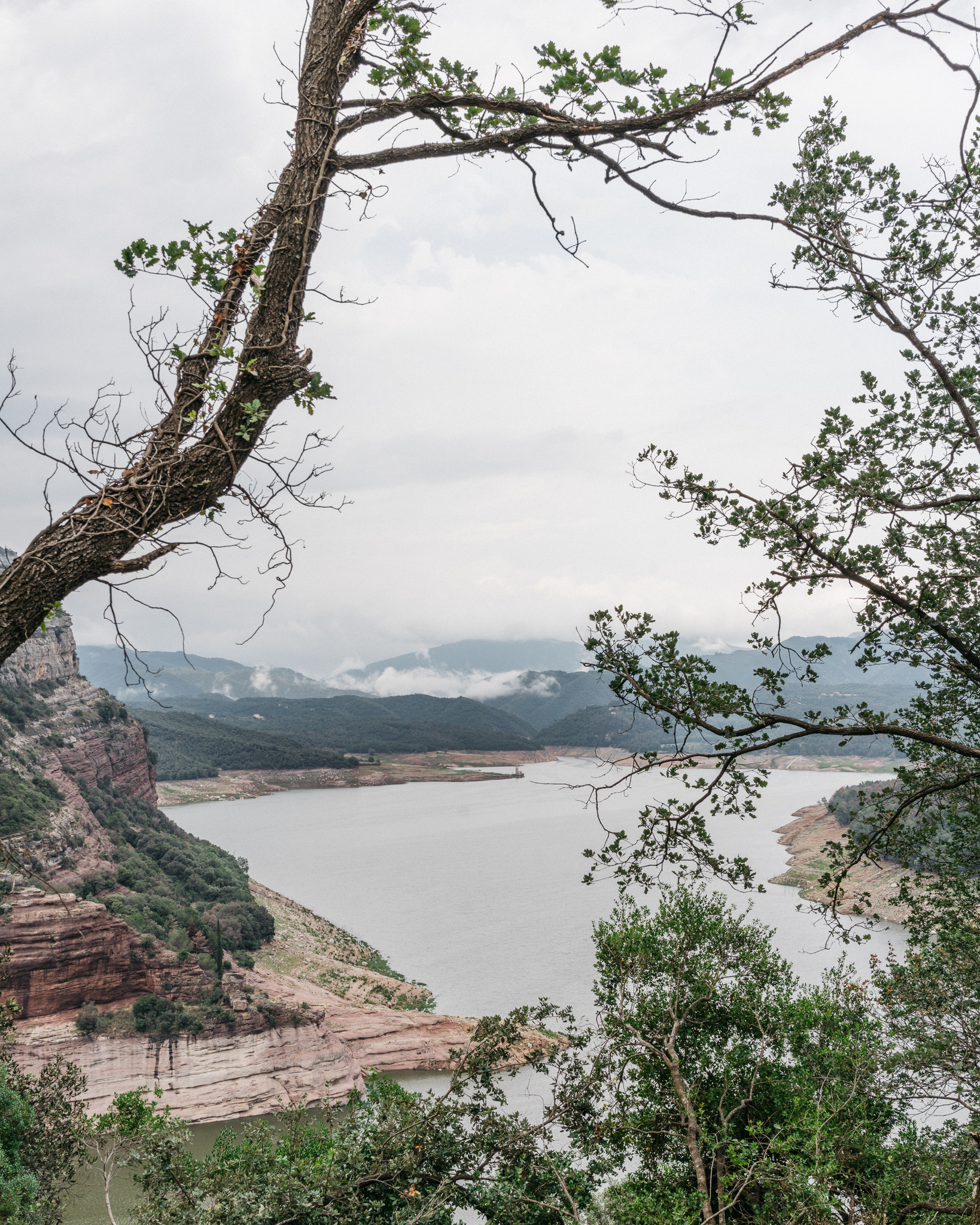(13) Vic-Sau water reservoir. The village of Santa Romà was submerged when the dam was built in 1962, but the church reemerged with the drought in 2023, as seen in the centre of the image. Catalunya, Spain. Regarding the Pain of the Future # 21, © Hilde Honerud, 2024.
