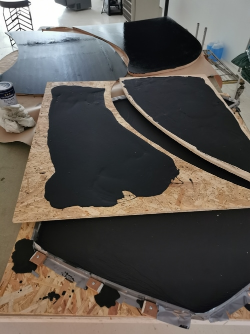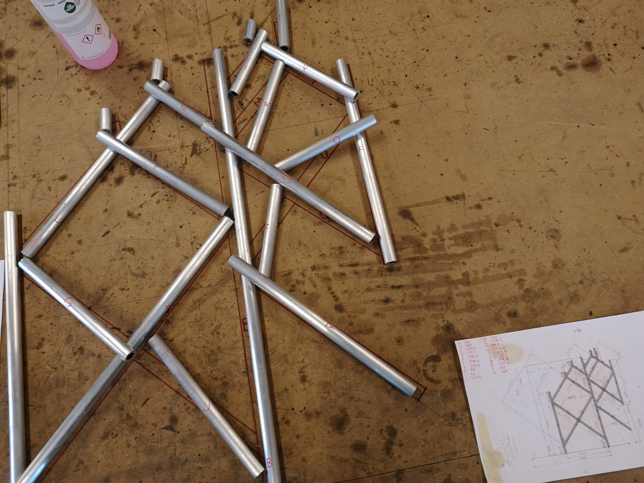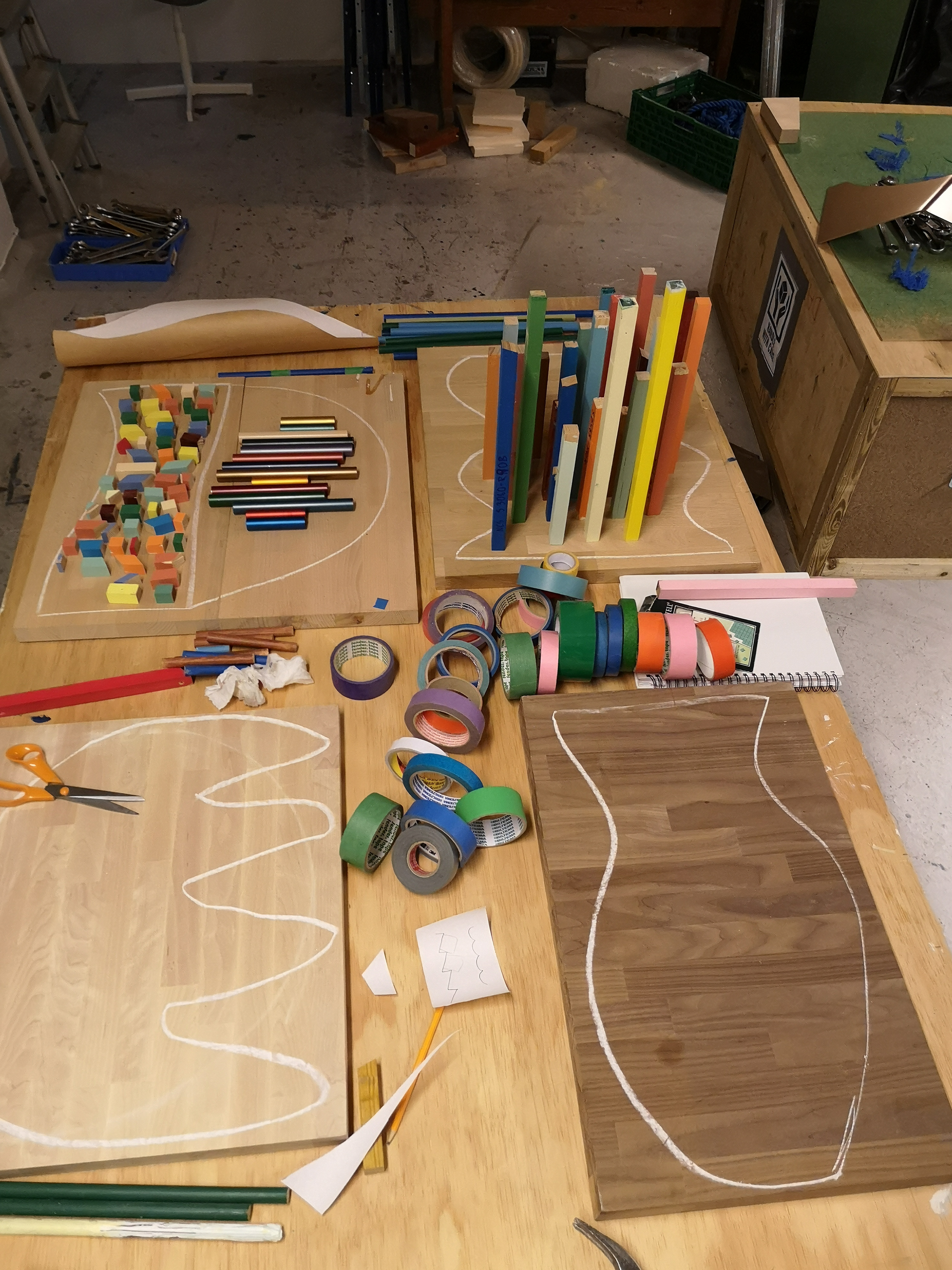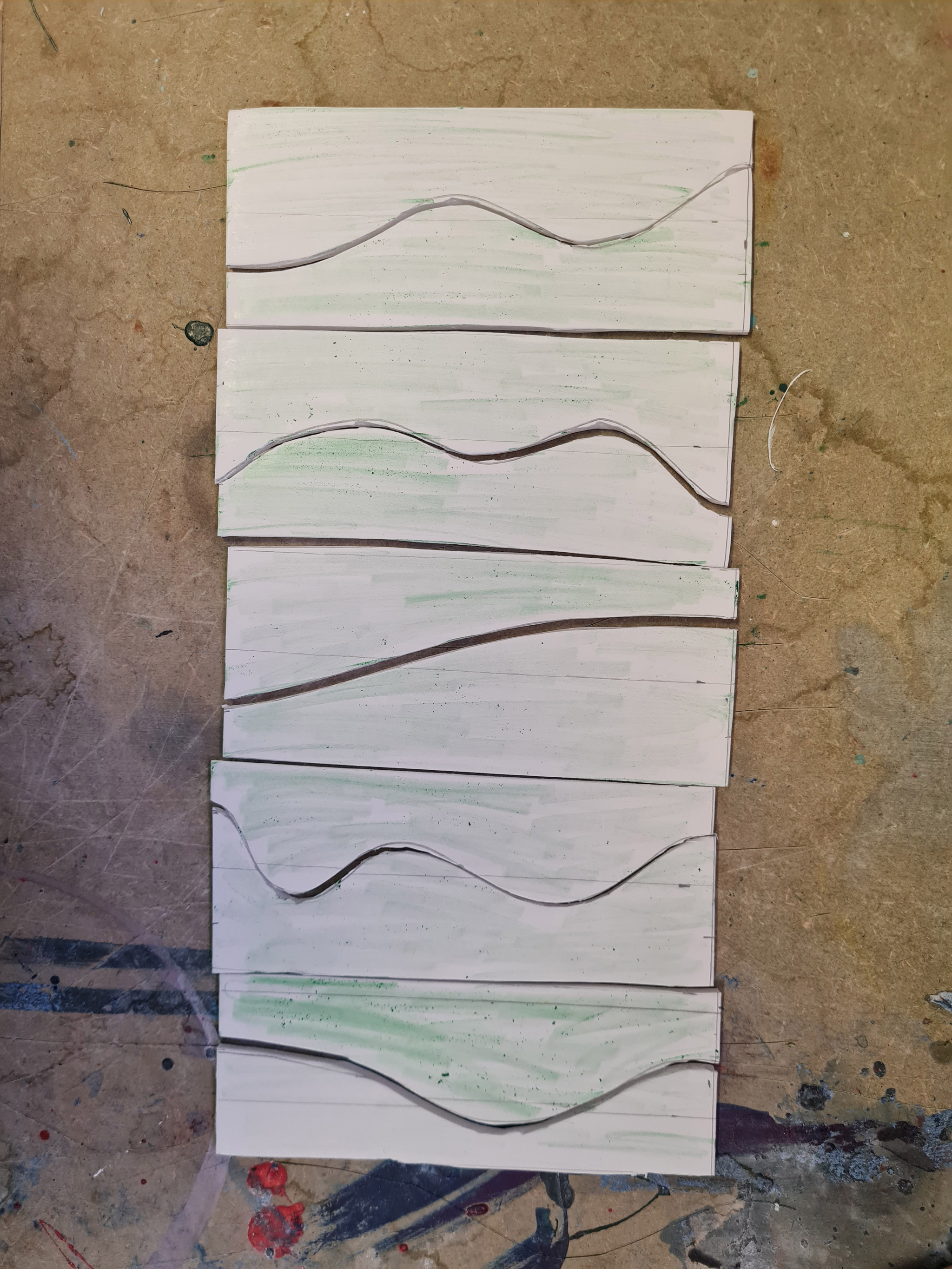 All eight parts of the floor in different heights, test fitting components before surface treatment