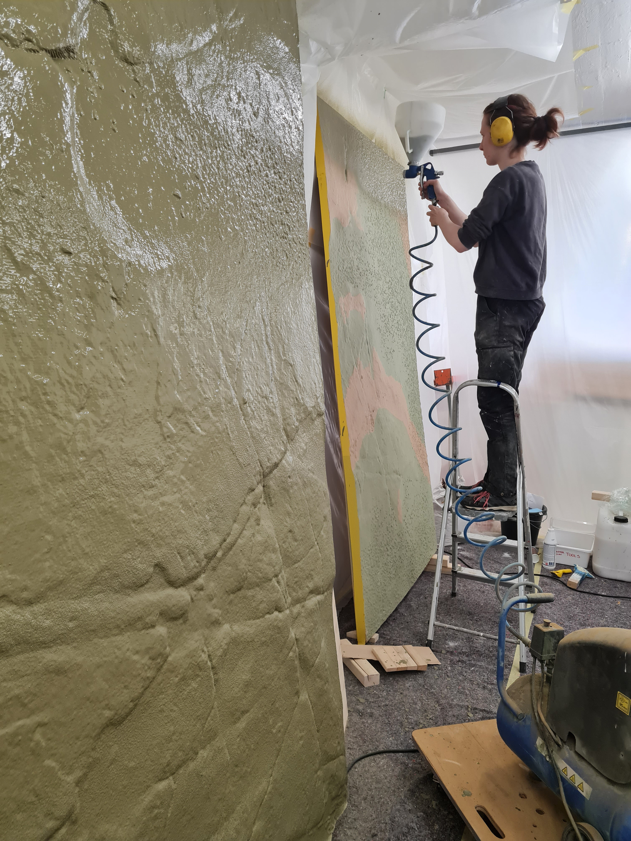 Spraying the floor with acrylic plaster after testing on small samples and trying out different colors