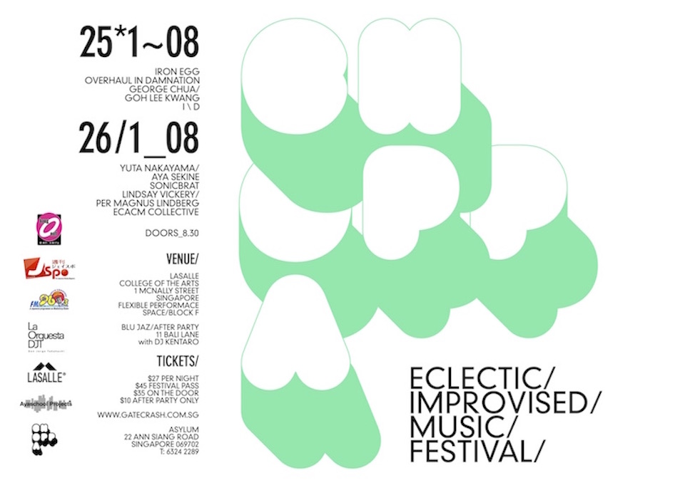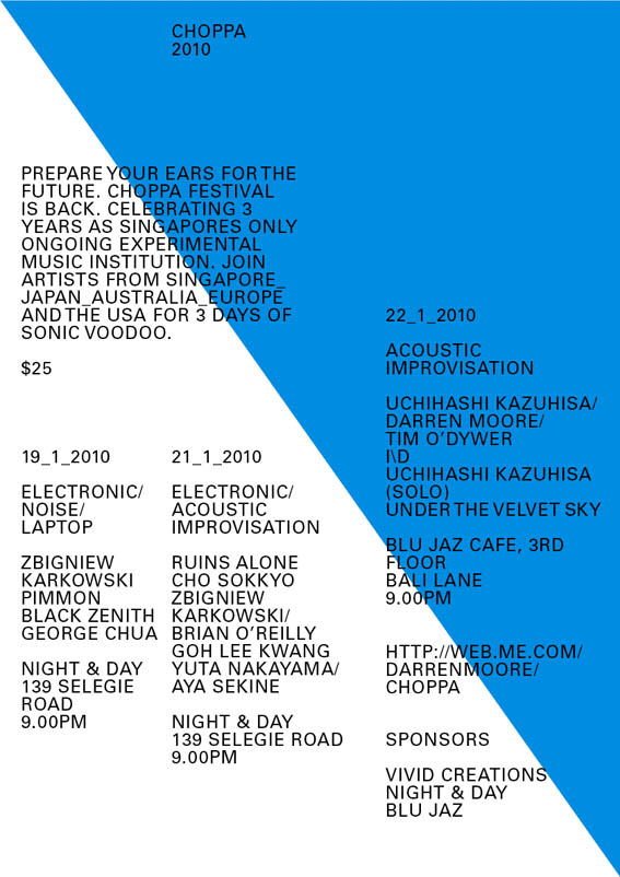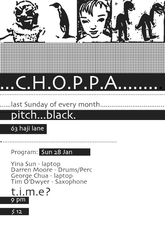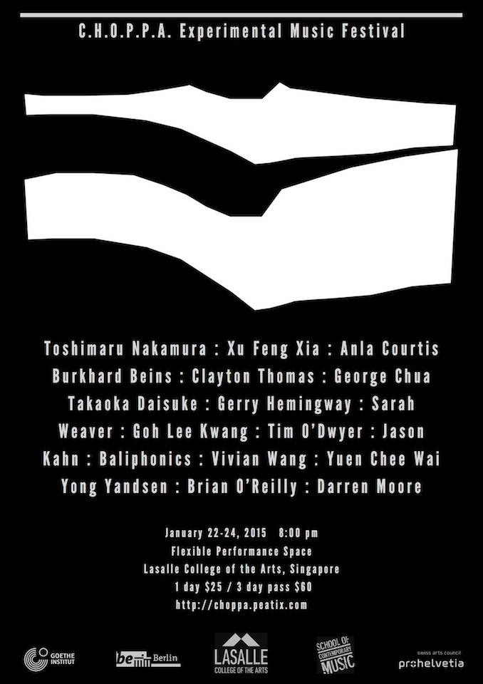 From 2008, the C. H. O. P. P. A. series changed its format from a monthly series to a more ad-hoc basis featuring local musicians and visiting international guests such as Robin Fox, Uchihashi Kazuhisa, Toshimaru Nakamura, David Toop, and Mike Cooper. During my involvement in the Melbourne and Sydney experimental music scenes before moving to Singapore, I had observed that there was a great emphasis placed on the development of a community around experimental music. In particular, I was influenced by the organizational model and curatorial approach of Clayton Thomas and Clare Cooper who founded the NOW now series and annual festival in 2001 in Sydney. The NOW now operated from the standpoint of nurturing a community of improvisers that was open and exploratory in nature through a grassroots, artist-run approach of self-organized, self-produced, and self-promoted concerts.
