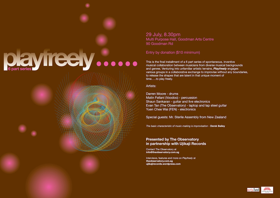 In 2011, The Observatory initiated the Playfreely series, which aimed to bring together improvisers from varying backgrounds. The series, presented in partnership with Ujikaji Records, featured mainly local artists and several international guests. The event was originally inspired by the programming at John Zorn’s New York venue The Stone and was described in the collateral as “[e]mboldening cross-genre, cross cultural, unfettered music creation and collective improvisation”.
