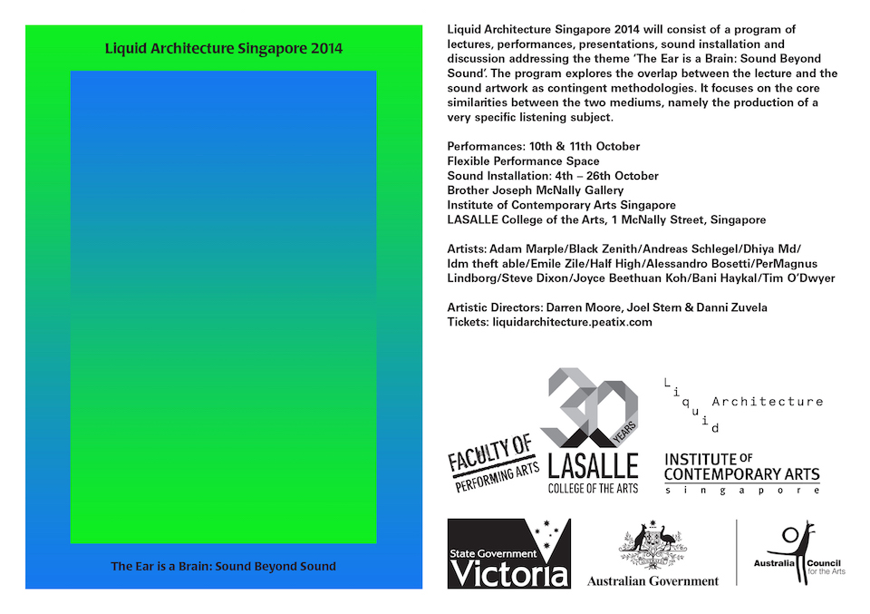 Liquid Architecture Singapore was presented by the Faculty of Performing Arts at LASALLE in collaboration with Liquid Architecture Australia and the Institute of Contemporary Arts Singapore. Liquid Architecture is widely regarded as one of Australia’s leading sound art festivals and has brought together works across a range of disciplines to audiences in Melbourne, Sydney, Brisbane, Perth, and Singapore. It was the first time that the festival held a subsidiary event outside of Australia, reflecting the emerging dialogue between Australian and South-East Asian artistic practices.
