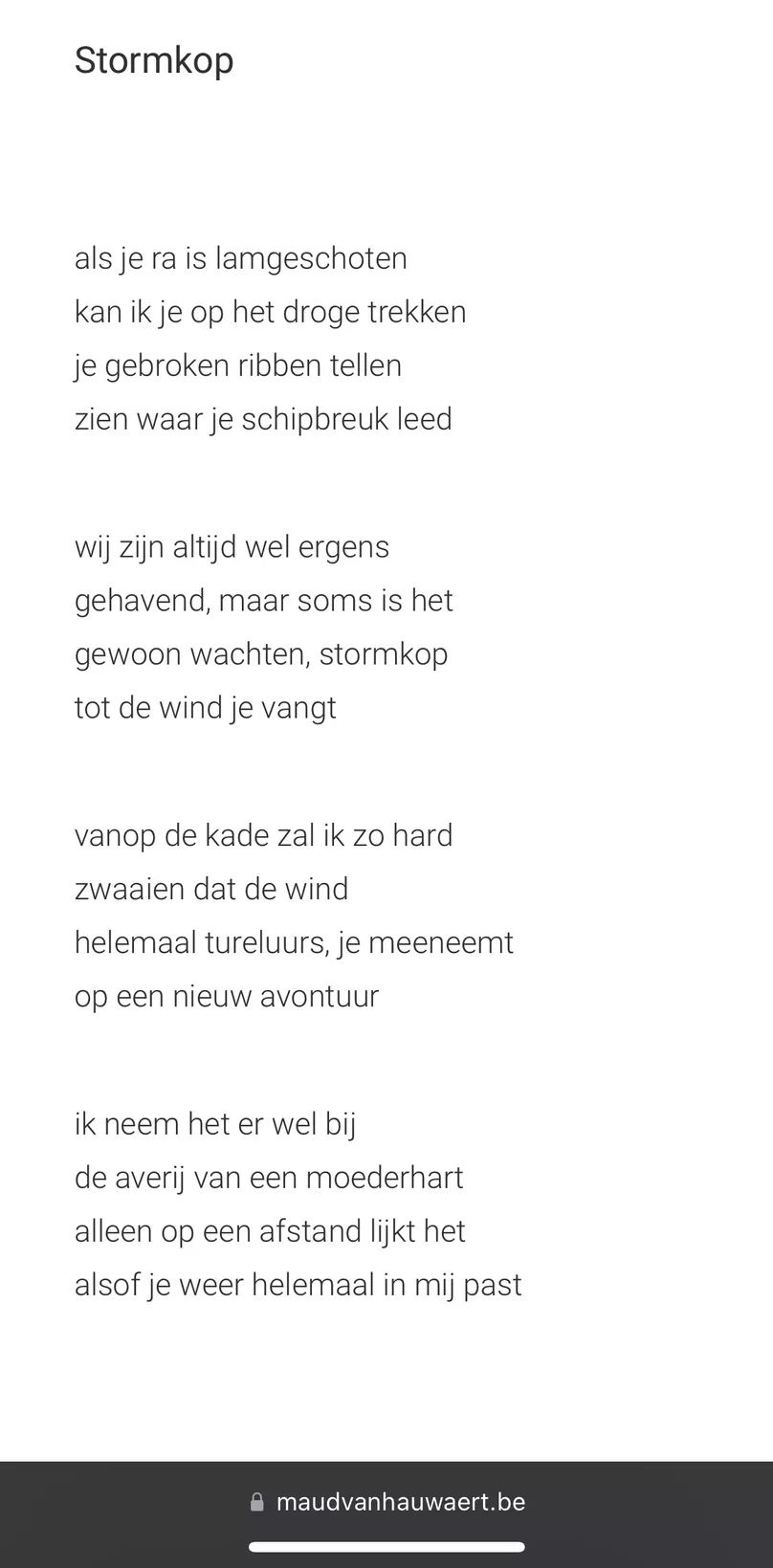 In het gedicht spreekt een moeder haar kind aan. Ze vertelt het kind dat zij het altijd zal willen opvangen. Je zou kunnen zeggen dat zij een droogdok aanbiedt waar het kind altijd weer op krachten kan komen, vooraleer het weer het ruime sop kiest. Het gedicht spreekt ook over de moeite die het een moeder soms kost om haar kind los te laten. Ik heb de naam Stormkop verwerkt in het gedicht. Een prachtig woord, dat vele interpretaties kan dragen.