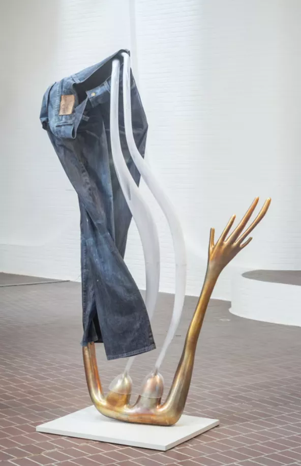 - Materiaal Cast bronze, patinated; 3D-printed plastic; jeans, sewn, reinforced