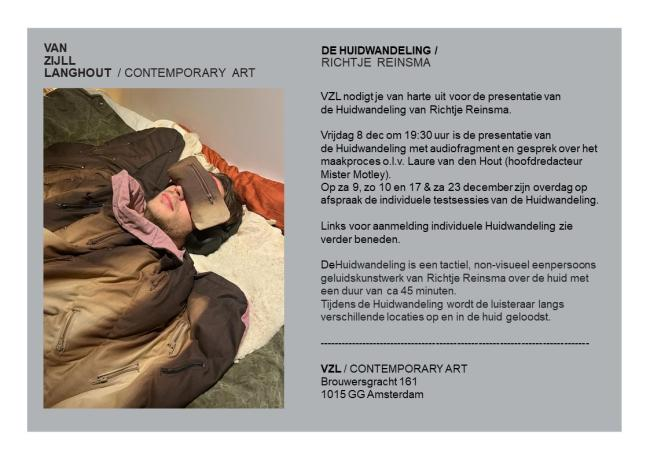 Beschrijving Amsterdamse kunstenaar Richtje Reinsma onderzocht hoe een geluidskunstwerk je een route kan laten afleggen door je lichaam. ‘Behalve opwinding over de bewegingsvrijheid die de geluidswandeling als medium biedt, is er ook een droefgeestiger drijfveer om het lichaam in te willen trekken. Zo lang ik me kan herinneren word ik zo nu en dan overvallen door het vervreemdende gevoel dat ik niet precies weet waar ik me nu precies bevind, in mijzelf.’