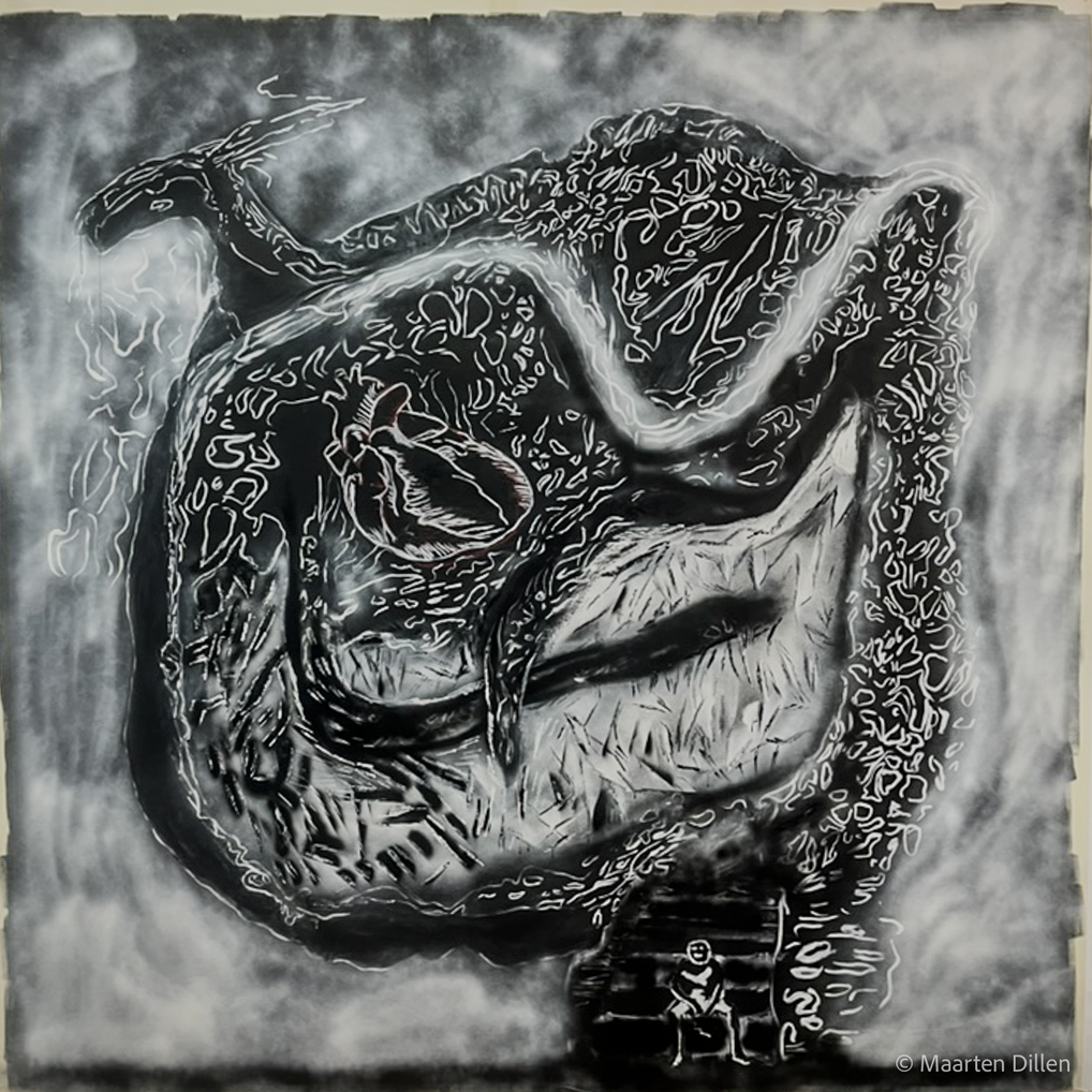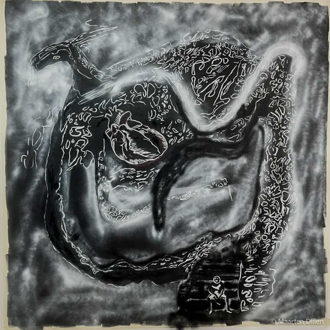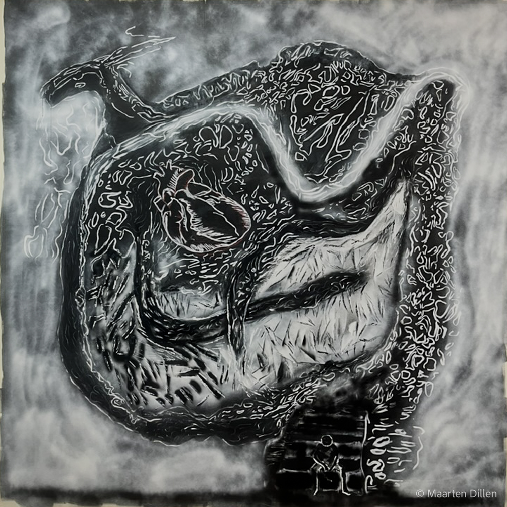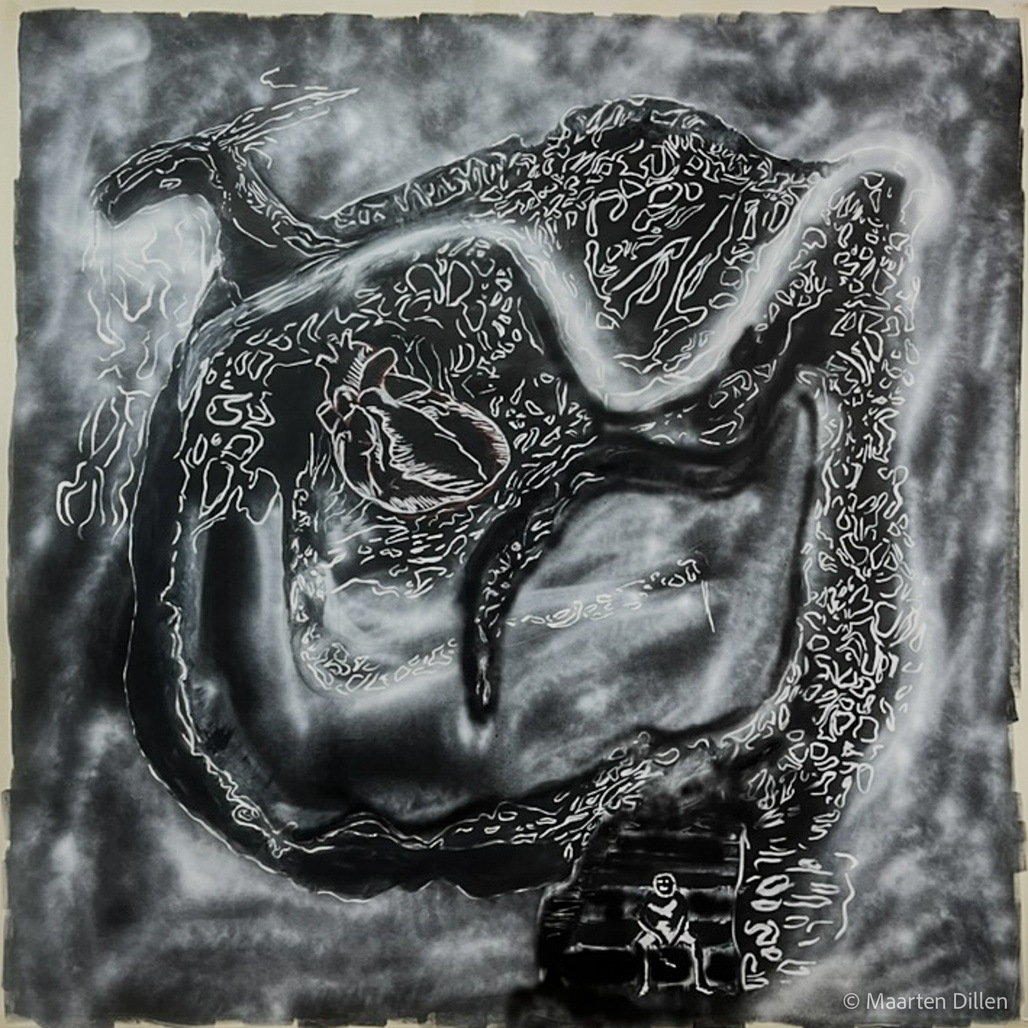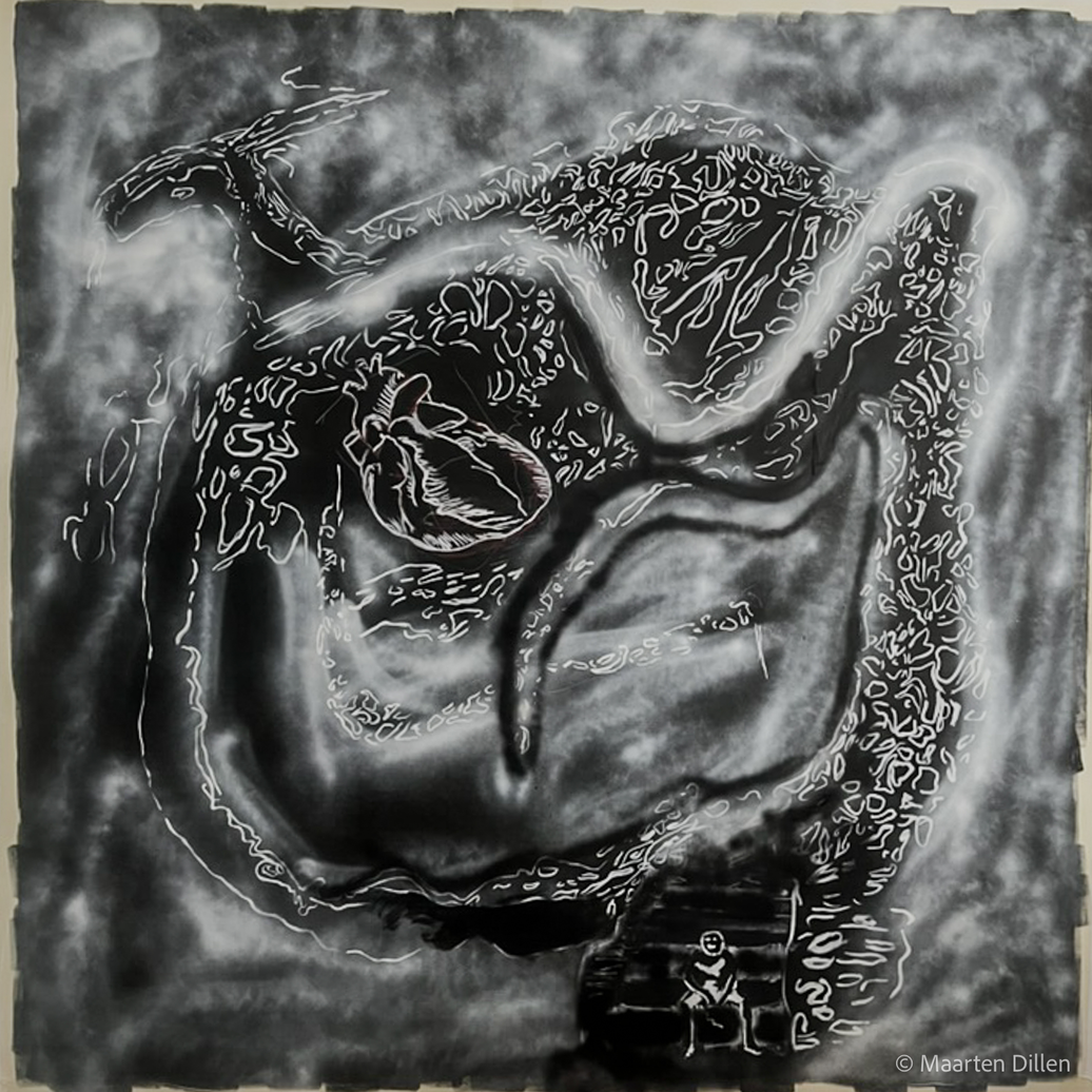 However, I didn't want to draw a realistic figure, as that would compete too strongly with the heart. The figure needed to serve as a hook to draw viewers into the painting. Therefore, I gave the figure a smiley face that looks at the observer. This adds a somewhat macabre quality to the figure.
