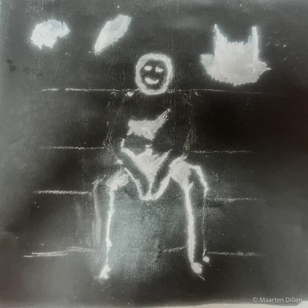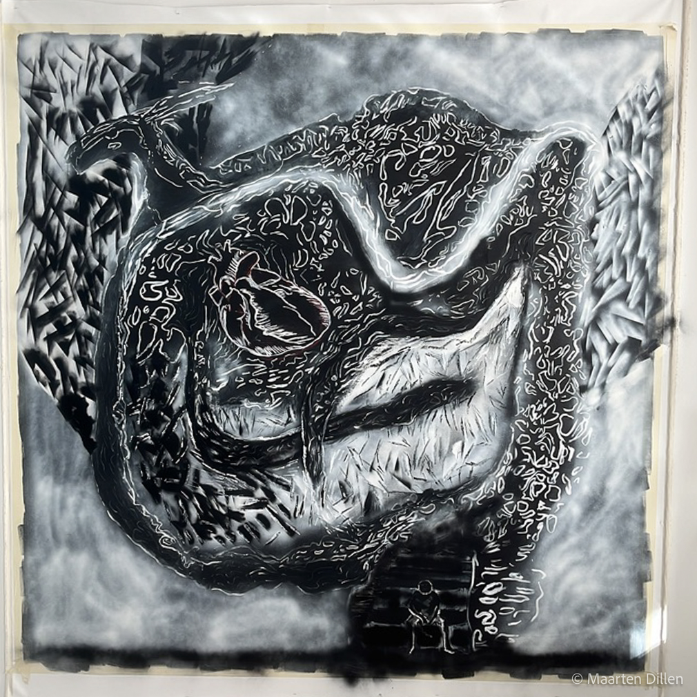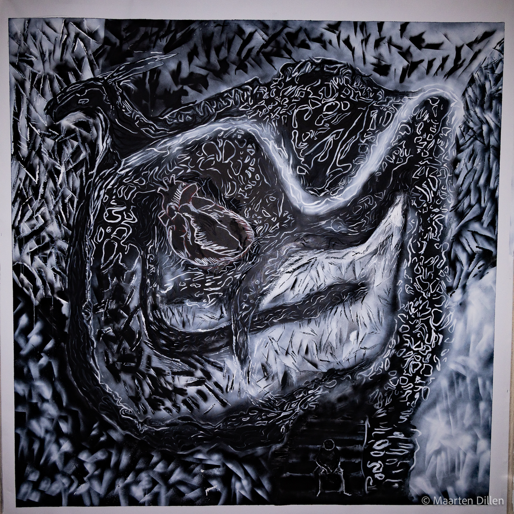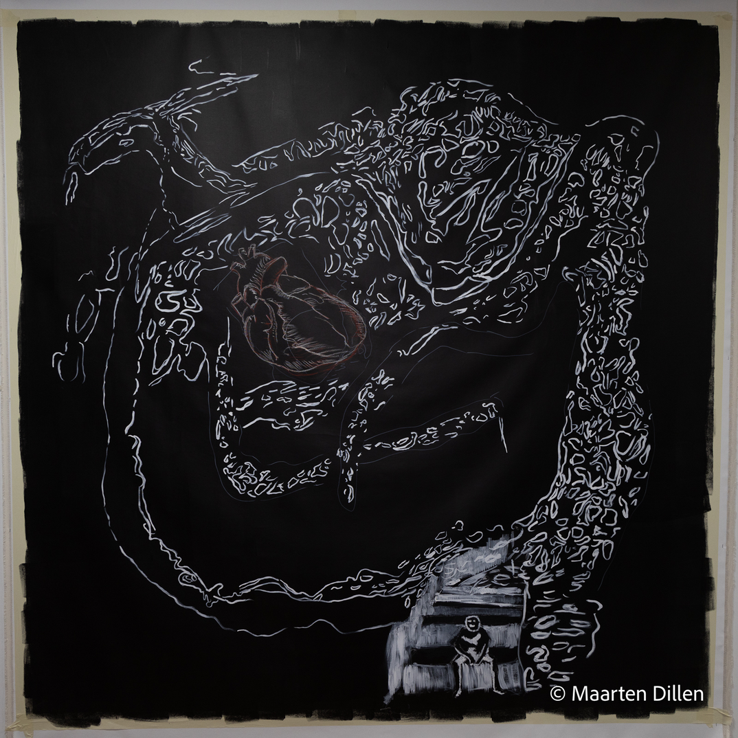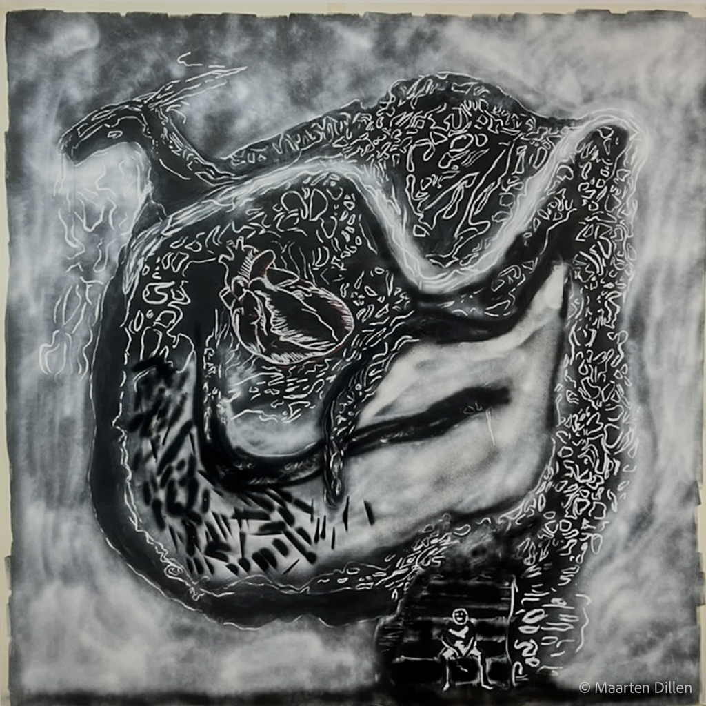 However, I didn't want to draw a realistic figure, as that would compete too strongly with the heart. The figure needed to serve as a hook to draw viewers into the painting. Therefore, I gave the figure a smiley face that looks at the observer. This adds a somewhat macabre quality to the figure.