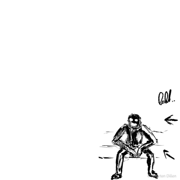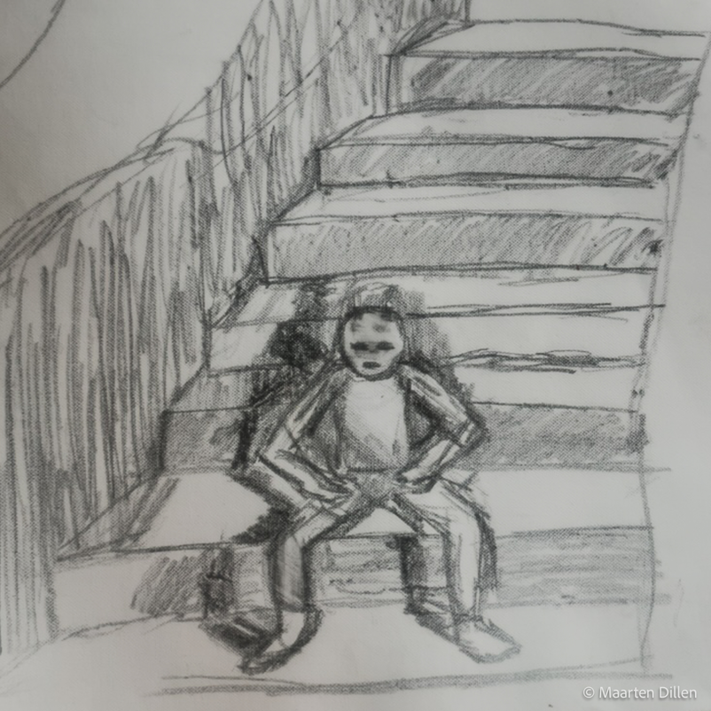 In the image, you see a person sitting on a stair, bent over, and looking down. Behind them, a staircase leads into a hallway. Initially, you sense a direction, but as you look further, it becomes muddled. The scene twists and curves into abstract forms, some of which are recognizable, such as the head in the top left.