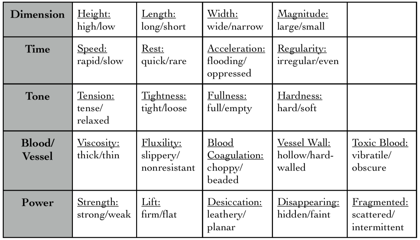 In his book, Wood breaks down the various manifestations of the pulse based on different polarities in 5 different categories, which are: dimension, time, tone, blood & vessel, and power: