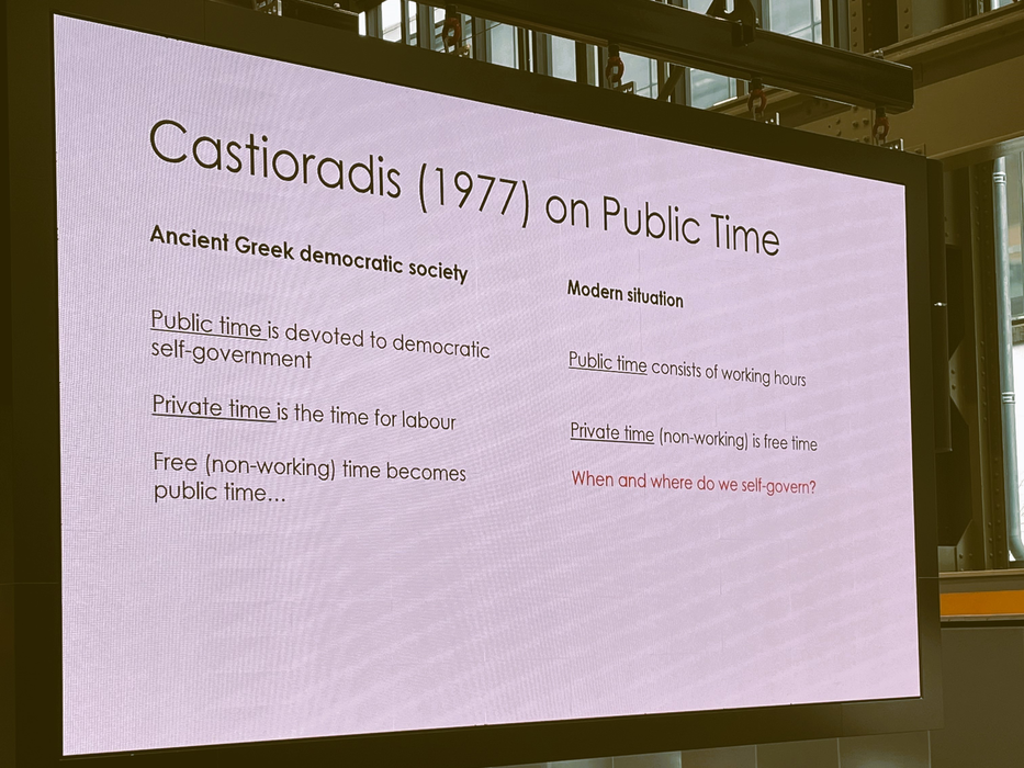 Drawing from Castoriadis’ view on public time, in contemporary societies communities are given limited (or in cases no) time to truly reflect on their past and codesign their future. The economic conditions and the way each state functions are again indicative of the function of public time and who has access to it. There is a need to reflect on who is excluded from political, public time and why. To respond, we first need to reflect on what is public time and how it differs in each context.