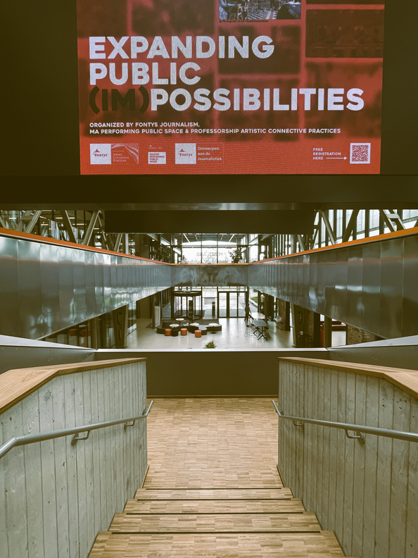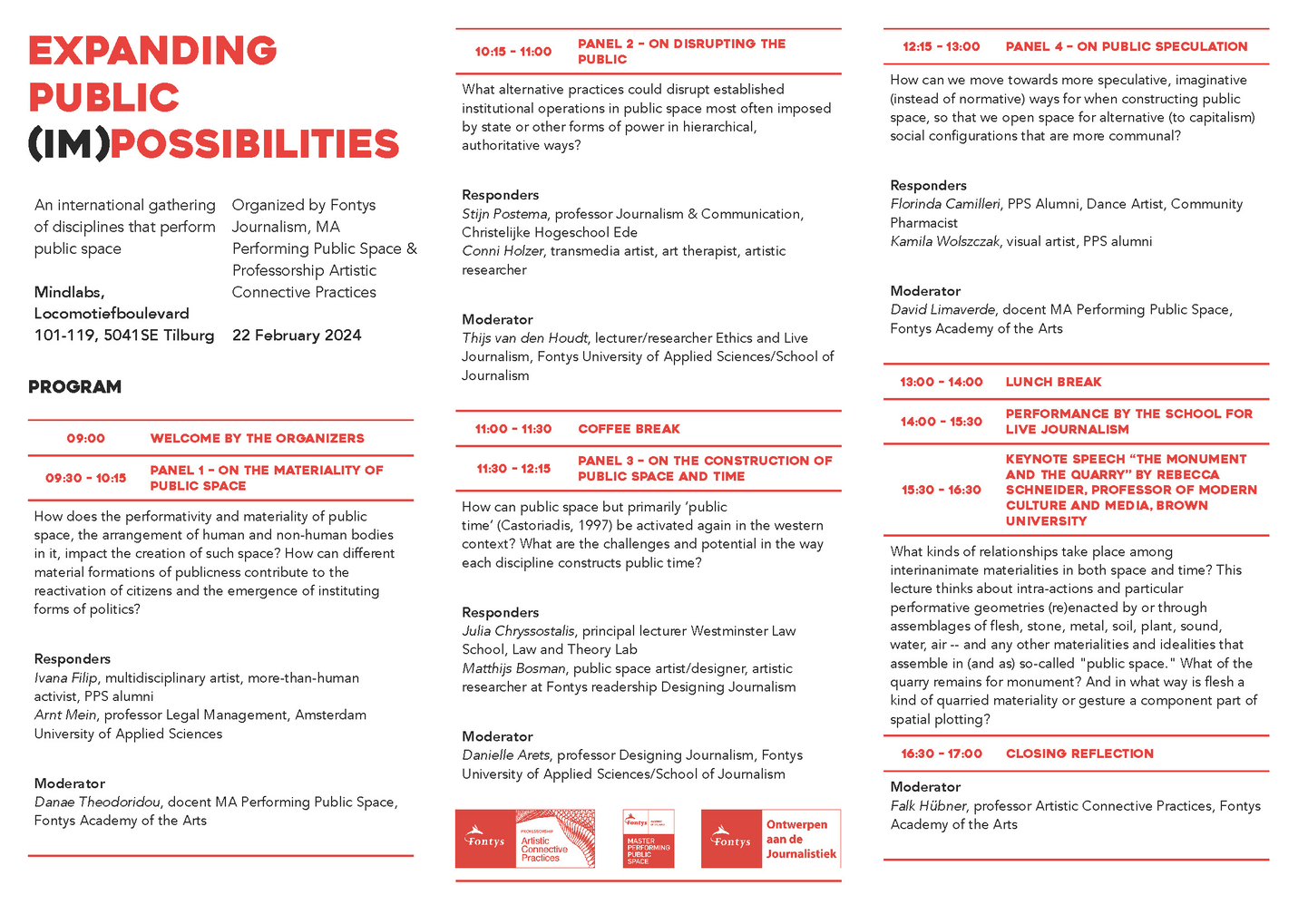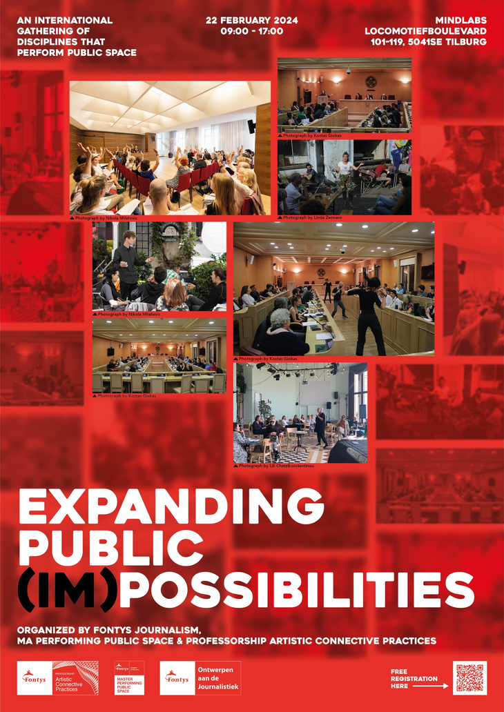 The event took place on Thursday, February 22, in a small amphitheatre inside Mindlabs in Tilburg and was organized by the Fontys Professorship Artistic Connective Practices, the Master Performing Public Space and the Academy of Journalism. Participants included artists, researchers, educators, and higher education students. The gathering was structured in four panels centred around four distinct but closely interrelated topics, re-approaching and reflecting on publicness: