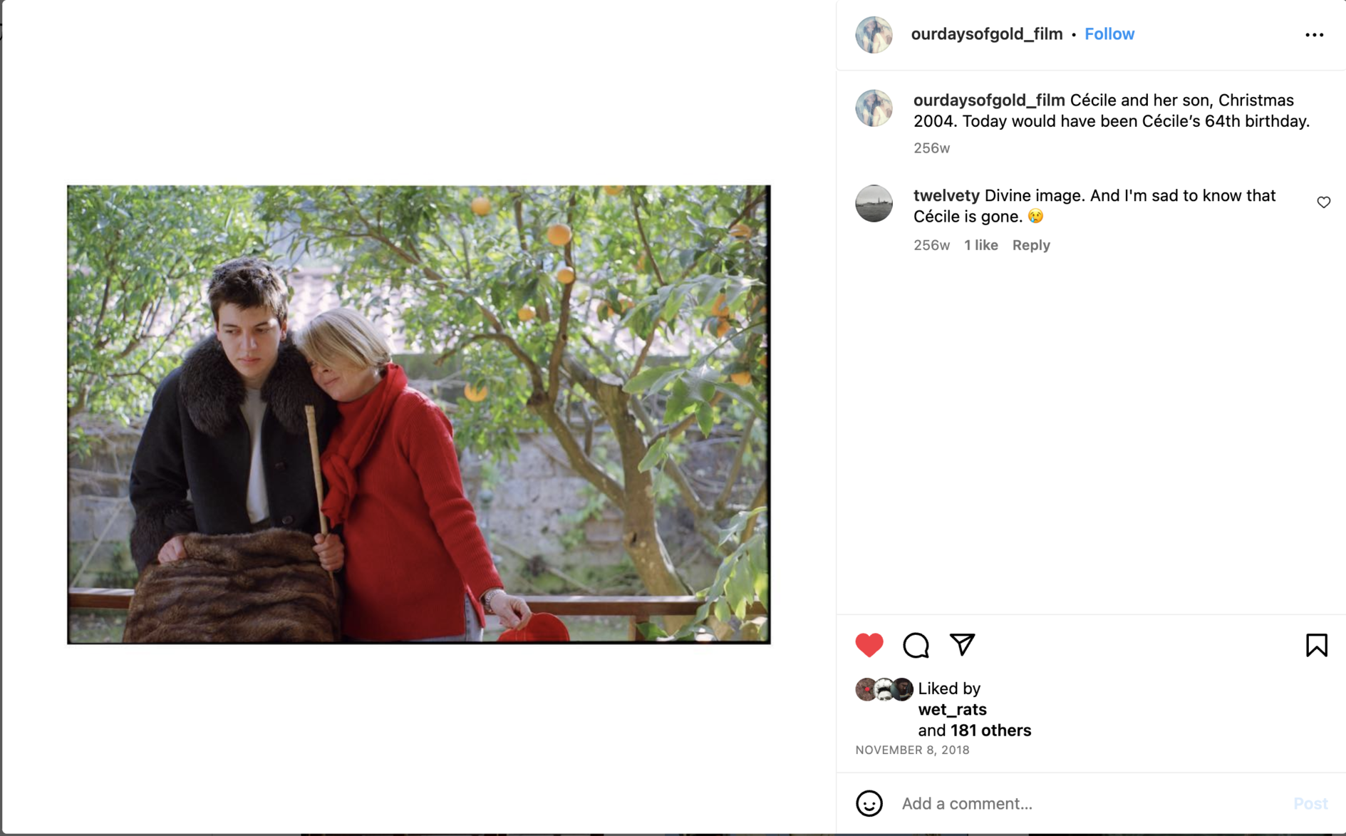 TN: So interesting that you ask about Cécile...I mean, I'm aware that the "characters" are usually indicated in their relationship to Cécile, but when I read the question I thought: you know, i don't feel like I've seen her for some time. I think somehow I see more of @ourdaysofgold_film than the other pages, for whatever algorithmic idiotic reason, and I think she hasn't been there so much lately. I know that at various times I have wondered if YOU are one of the characters in ODOG--I've certainly wondered whether they are real people, and are appearing under their real names, or of the whole thing is a fictional creation. I don't really have any idea who you actually are, or whether you're in it yourself or not. I think I may have wondered if you ARE Cécile, but then I also have some sense that maybe she's no longer alive, but I couldn't tell you where exactly that feeling comes from. Which is maybe to say that I don't know very much about Cécile, but I am intrigued by her and her world and would relish the chance to spend more time with all of her friends and family. I have wondered what the scope of your project is--whether there is a film, or a book, in the making, whether I will ever take the time to sit down and pore through what's on Instagram to try to see what sense of a larger, arcing narrative I might be able to glean. But i am someone who thinks in stories, and so it is the stories of the people in ODOG that intrigues me, along with the pure pleasure of the beauty of the images.
