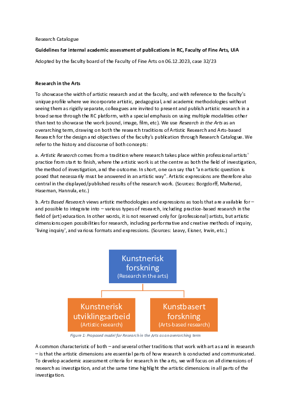 To showcase the width of artistic research and at the faculty, and with reference to the faculty's unique profile where we incorporate artistic, pedagogical, and academic methodologies without seeing them as rigidly separate, colleagues are invited to present and publish artistic research in a broad sense through the RC platform, with a special emphasis on using multiple modalities other than text to showcase the work (sound, image, film, etc). We use Research in the Arts as an overarching term, drawing on both the research traditions of Artistic Research and Arts-based Research for the design and objectives of the faculty's publication through Research Catalogue