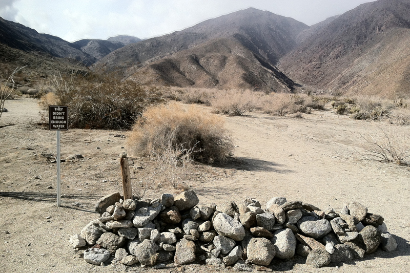 On a hike toward the beginning of the trip that is suggested here, we came across a sign erected some yards beyond the trailhead: “THEY DIDN’T BRING ENOUGH WATER.” The subject of the statement is seductively vague (maybe we are this they!) but its meaning is made clear enough by the body-sized mound of rocks the sign notates. In the days that followed, the sign’s statement hovered as a kind of aphorism for the methodology we found ourselves slipping into. A methodology because this is a research trip: I will meet you there, we will rent a car, and we will collect water samples from the sites we visitfind. In the preceding months our reading list and subsequent conversations had frequently turned to water. We coined a term whose definition we hoped we might unfold a bit on the desert trip: liquidarity.