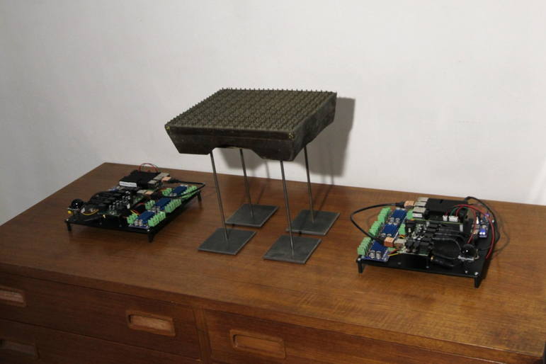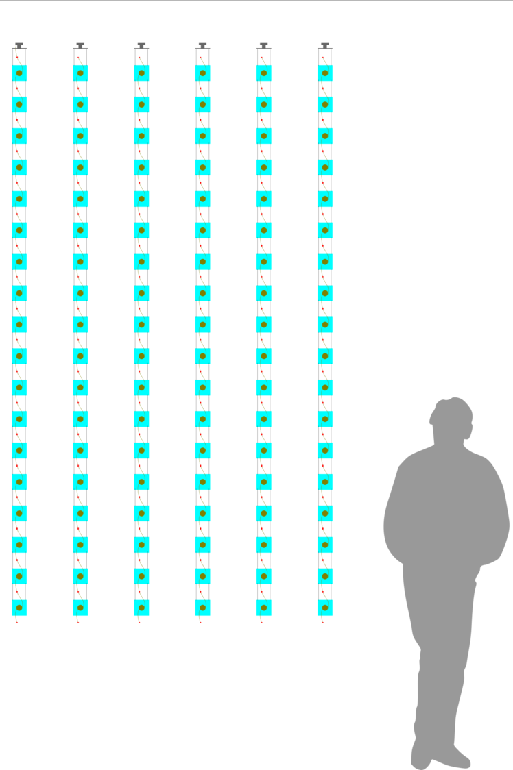 The “suspend” reticule is the one to be shown in Neue Galerie as part of the “Rotationskörper” exhibition. It is the continuation of the experiments at KiG, namely to hang six lanes of 18 weave glasses, each with a servo, one node with new board.