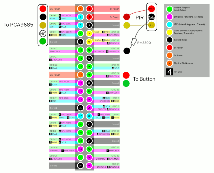 The node will have button, PIR, and PCA9685 connections, thus requiring a custom pin header that unites these three functions. We use a left-over full header from in|filtration.