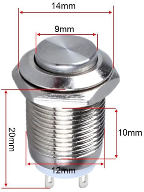A metal push button with ø 12mm mounting hole, two wires connected with JST to the GPIO pins GPIO5 (Wiring Pi 5, BCM 24) / GND (header 18, 20).