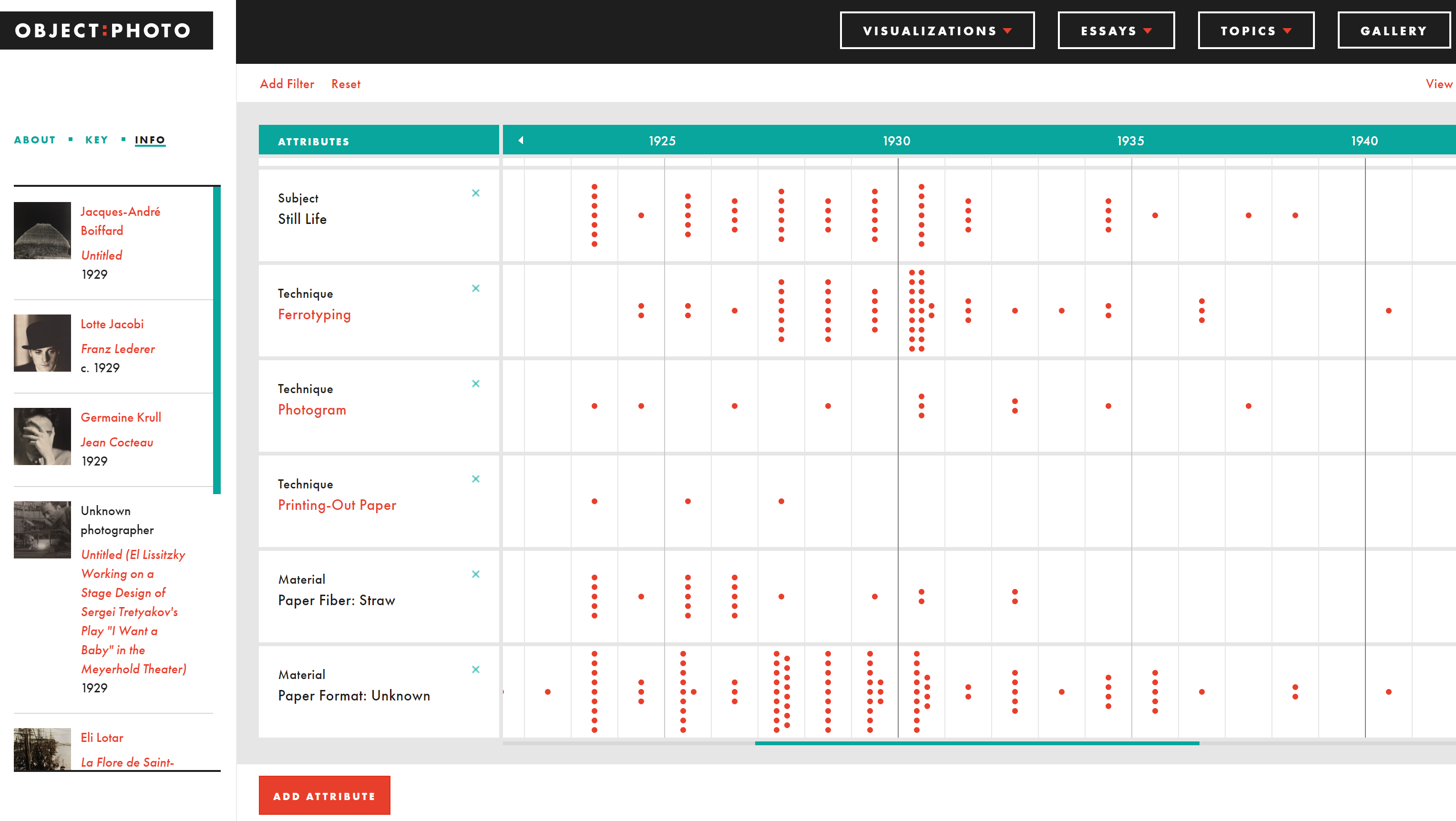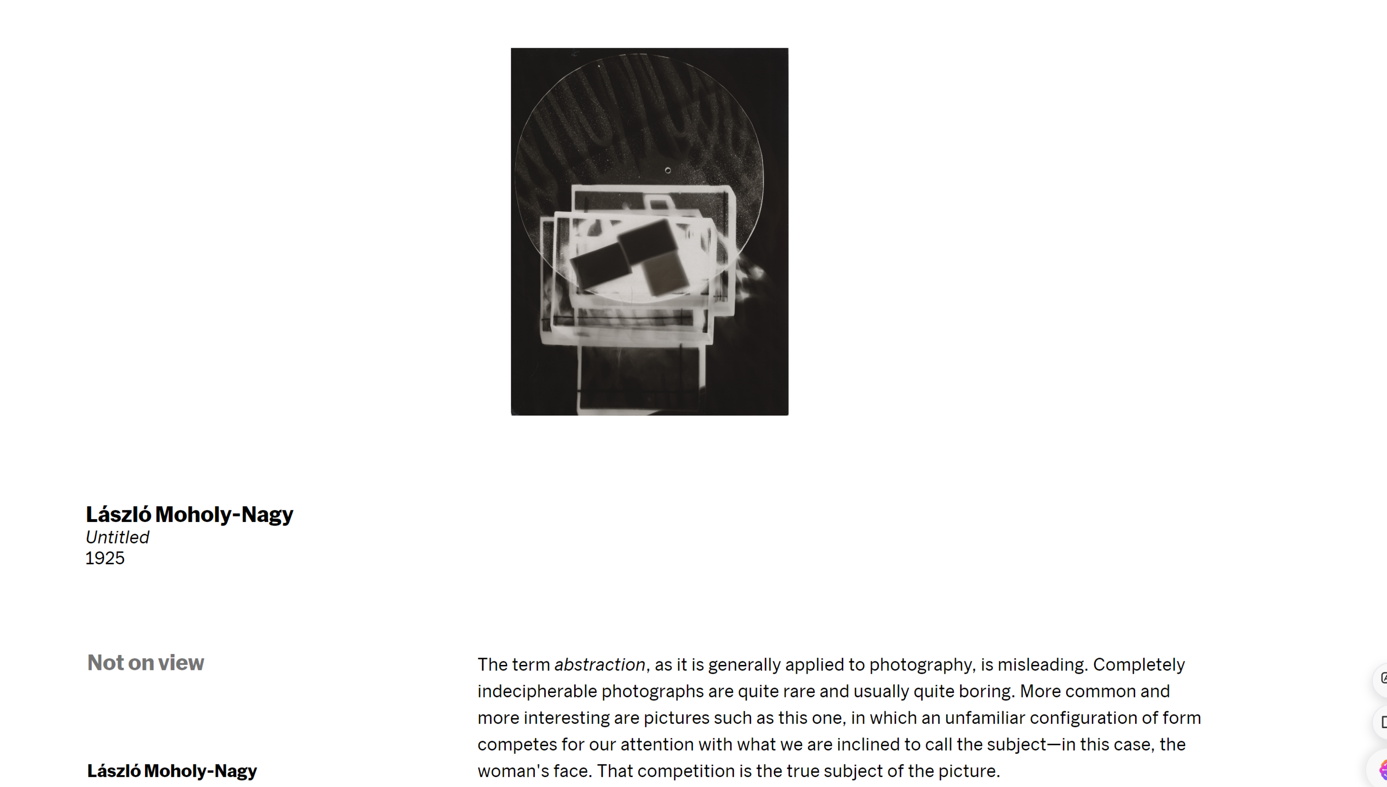 Tijdens mijn zoektocht naar materialiteit ontdenkte ik de database OBJECT:PHOTO. Een initiatief van MoMA waar je een collectie beelden kunt vinden die gemaakt zijn tussen de eerste en tweede wereldoorlog. In deze tijd werd er actief gebruik gemaakt van zowel oude als nieuwe vormen van fotografie. In deze database kun je foto's mappen, kunstenaars linken aan elkaar, ontdekken welke materialen en technieken er gebruikt werden. Via deze website heb ik veel kunnen leren over oude druktechnieken die op dit moment zelden worden gebruikt zoals Ferrotype. Ook qua materiaal waarop gedrukt is door sommige fotografen ben ik geïnspireerd. Denk aan papier gemaakt van stro. Hier boven hebben we het al gehad over analoge fotografie en experimenteren binnen de fotografie. Voeg hier materialiteit aan toe en dan hebben we het voor een groot deel over mijn artistieke praktijk. En al de besproken informatie tot zo ver hebben mij geïnspireerd, niet alleen voor mijn eigen praktijk maar ook om de eindeloze mogelijkheden die fotografie bevat door te geven aan mede-fotografen, studenten en jongeren om mij heen.