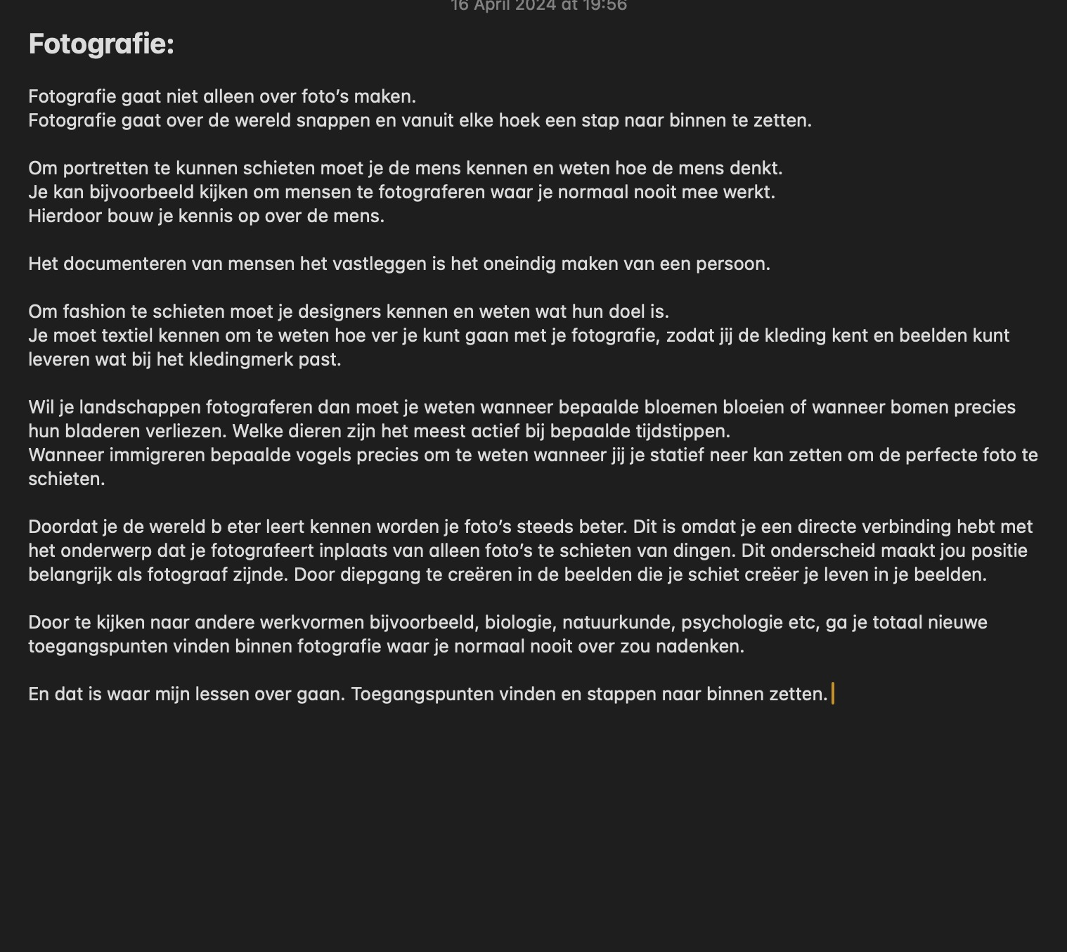 Het idee dat je als fotograaf niet alleen maar hoeft te gaan fotograferen maar dat theoretische kennis je foto's kan versterken is een mooi idee. Dat je weet hoe je onderwerp in elkaar steekt en hoe je je verhaal dus op beeld kunt overbrengen. Vooral in het gebied van documentaires denk ik dat het belangrijk is dat je meer weet dan alleen de foto's maken. Voor Arijan zit de kracht van fotografie de wereld leren kennen en begrijpen zodat je een directe connectie ervaart met hetgeen wat je fotografeert.