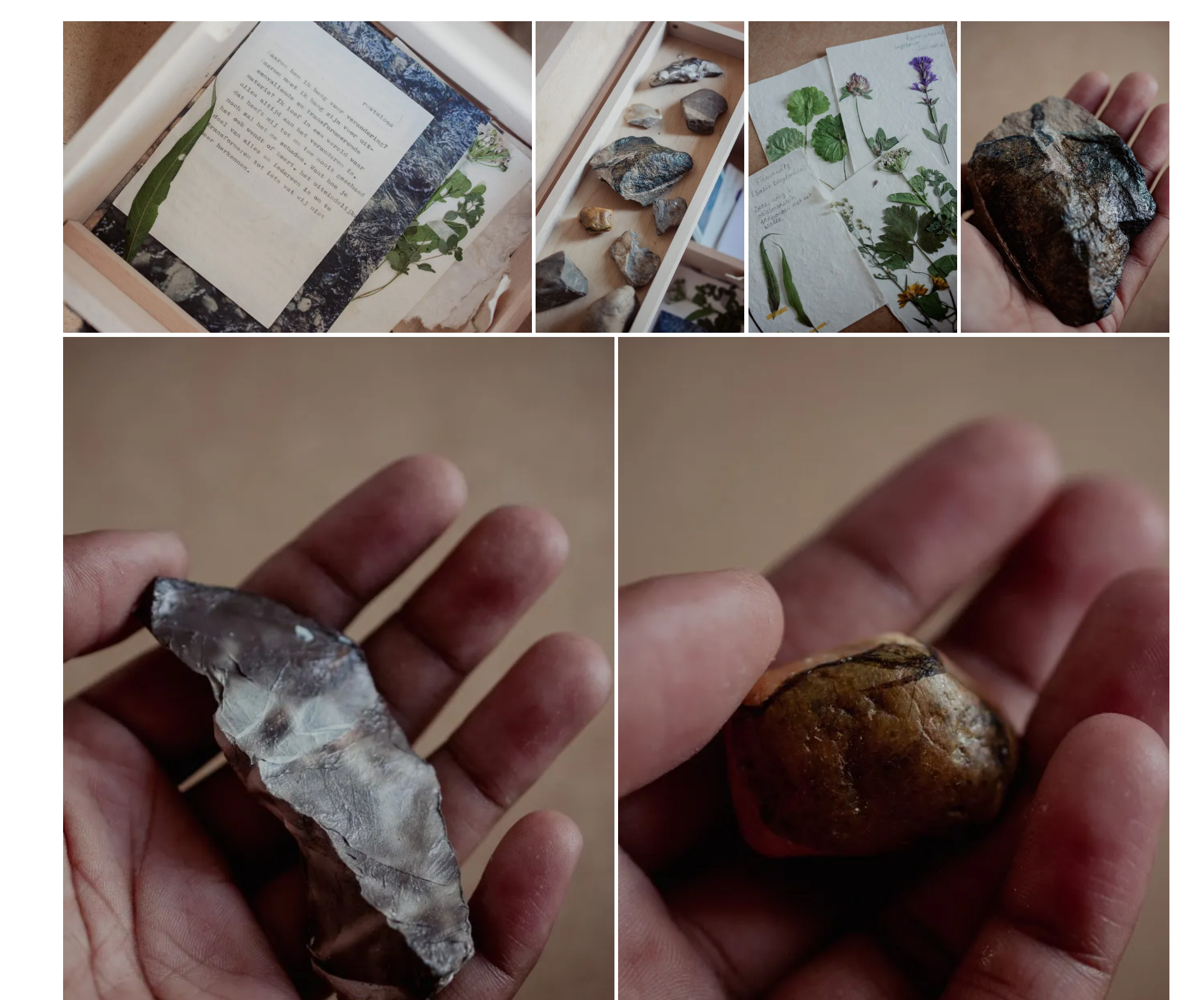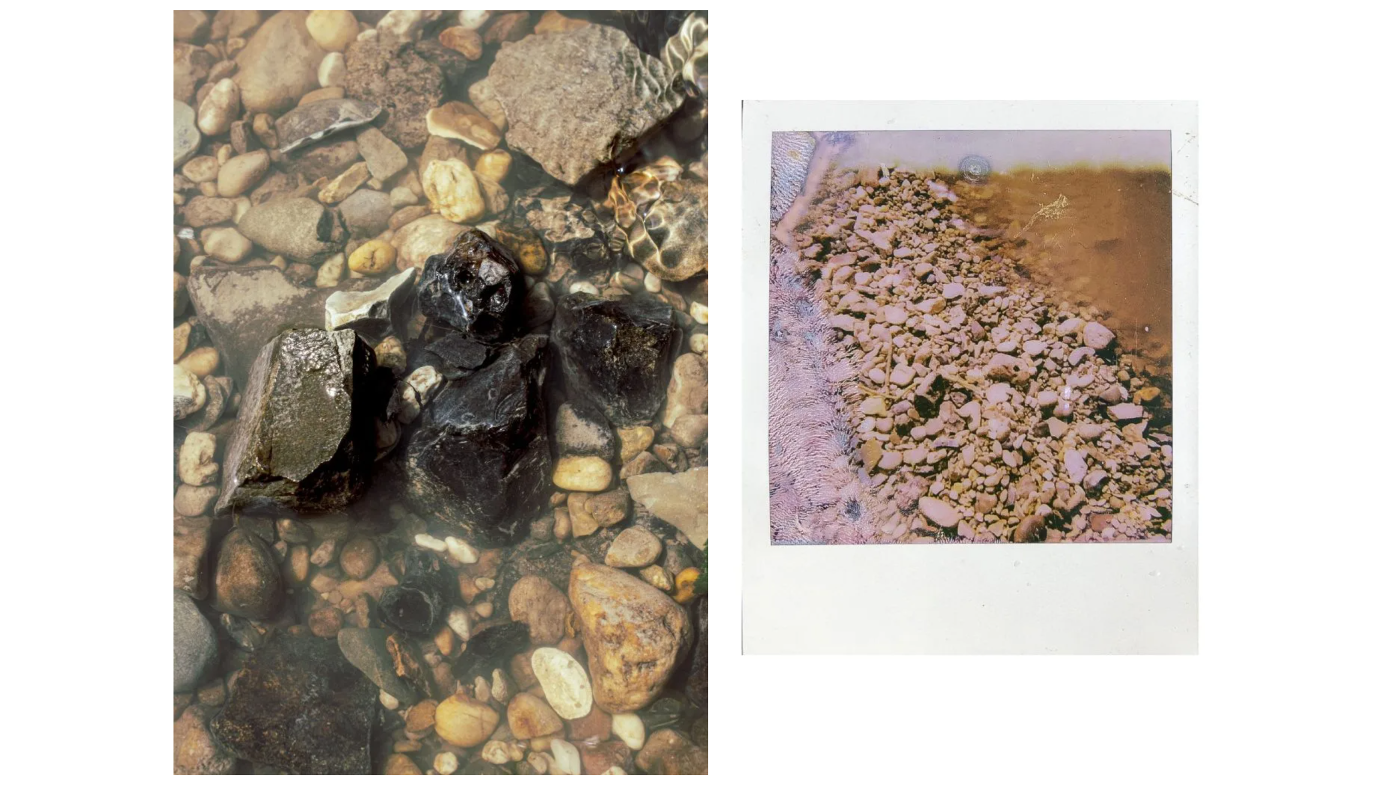 Het werk bevat elementen uit de natuur zoals stenen en bloemen. De stenen zijn handmatig bewerkt en omzegeld met polaroids die ik in de natuur heb gemaakt. Dit heb ik gedaan aan de hand van de polaroid emulsion lift methode.