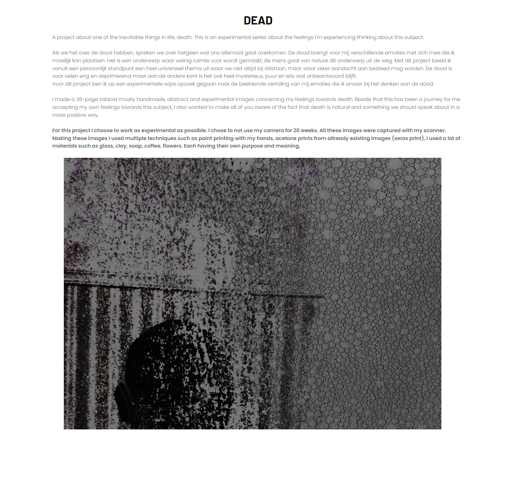 De beelden zijn allemaal met polaroid of met andere analoge camera's geschoten. Dit werk bevat alle elementen waardoor ik mij aangetrokken voel tot fotografie of beeld. Al deze elementen geven een extra laag en ondersteuning aan het geen wat je wilt vertellen en leveren een belevenis aan de kijker.
