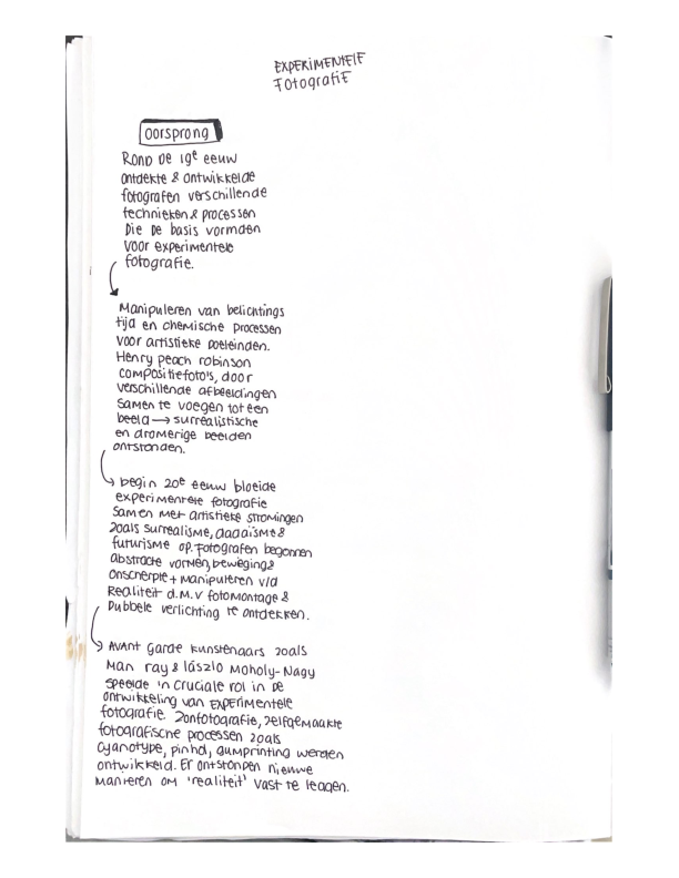 Dit is mijn eigen werk. Het project heet rusteloos en zoals je kunt zien bevat heet veel materialiteit. Het werk is analoog en experimenteel. De lijnen die je ziet lopen van de afbeelding naar de thema's die we bespreken geven aan dat ik dat deel van mijn werk koppel aan het experimentele, analoge of materialeit.