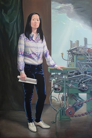 A portrait of Yu-Chen Wang formed part of the installation. Although depicting her more as an industrialist, its generic character is asynchronous with the period of this narrative. A second version of this portrait was included in the re-presentation of the exhibition in Manchester but showing the machines in ruin and the artist in a depressed state. This transformation is mirrored in the narrative.