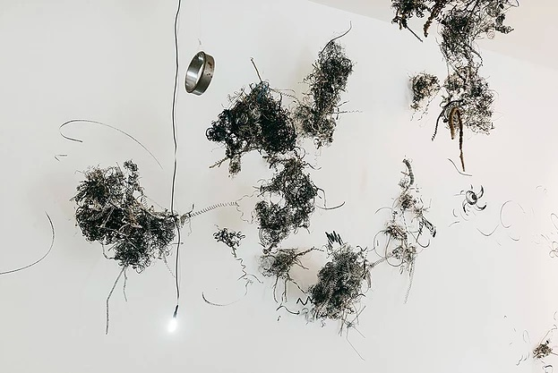 This is particularly manifest in Yu-Chen Wang’s installation in which the drawings on paper are surrounded by clumps of metal shavings. While these clumps are industrial waste, they also appear strangely organic. This transition from material to imaginary is founded in the artist’s work ‘The End’, a scenario or textual sketch that imagines a world where the atmosphere is saturated by clumps of unknown matter.