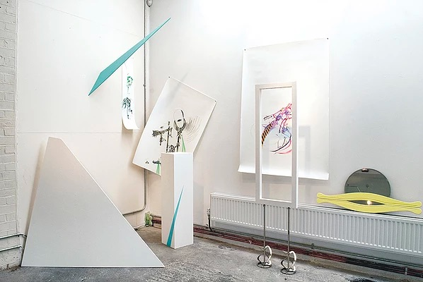 The village scene combines various aspects of Wang’s sculptures and drawings, which she has likened to the hodgepodge architecture of Taiwan that is almost universally added to by its residents. In her description of her drawing practice, Yu-Chen Wang described how her memories of these assemblages have informed her drawing practice as air-conditioning, advertising signs, and plants that thread their way through buildings in frequently precarious manners. The water rising from the road is also taken from a video work by Wang. A result of natural forces overwhelming public services, it echoes the sense of a tussle between the natural and artificial environment.