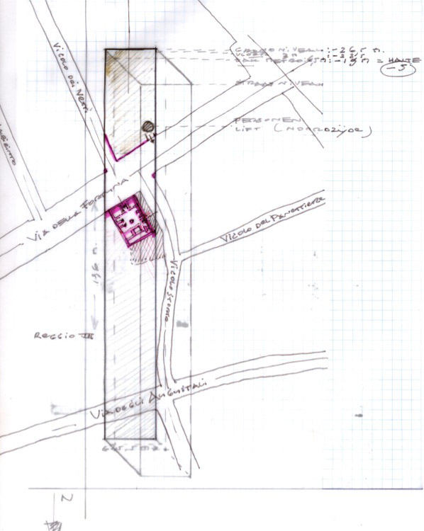 Since Pompeii I know: when you roll out your tape measure, the house is yours. By establishing the measures of a house, you make it your own. The door openings, the reconstructed heights, the windows, the now hidden evidence of where all sorts of things were in the house – traces of earlier archeological study invite further investigation. But at this point the artist in me awakens: I want to see it, make it, translate it according to my own standards. Even before having studied Penelope Allison's book on the subject, I had outlined my scale-model already, resulting from my own measurements. After half a year I called in an expert, and now I know that I could not have done otherwise in order to arrive at a proper interpretation of the Casa della Caccia Antica. Although this interpretation is now based on my own observations and measurements, it would have been different if initially I had had more knowledge available. This not-knowing I experience as valuable if not crucial – as artistic freedom in my design process, as a blankness that allows me to explore and develop my own options and visions. Most fortunately, though, after consulting the work of Allison my observations of the house proved correct, a few details excepted. But I also made a mistake: the door openings closed off with mortar and later rediscovered (from atrium to cellae and vice versa) were closer to the vestibulum/fauces. This means I have to render this entrance space slightly smaller. Yet this will only improve my design, in fact, also because it reveals more strongly the correspondence with the entrance areas of the Etruscan tumuli. What is at least as interesting, in my view, is my decision to put small windows on the west side of the house. Now I know that Roman law allowed placing windows that look out onto undeveloped land. There were in fact small windows on the west side, which were later sealed off with mortar when the adjacent property was built. Likewise, the slave quarters, which initially I removed intuitively, were actually built later, to fill up the undeveloped land on the eastern street side. How wonderful to be able to rely on your intuitive notions and to be able to believe what your eyes can see! (Note in the margin, 31 May 2011)