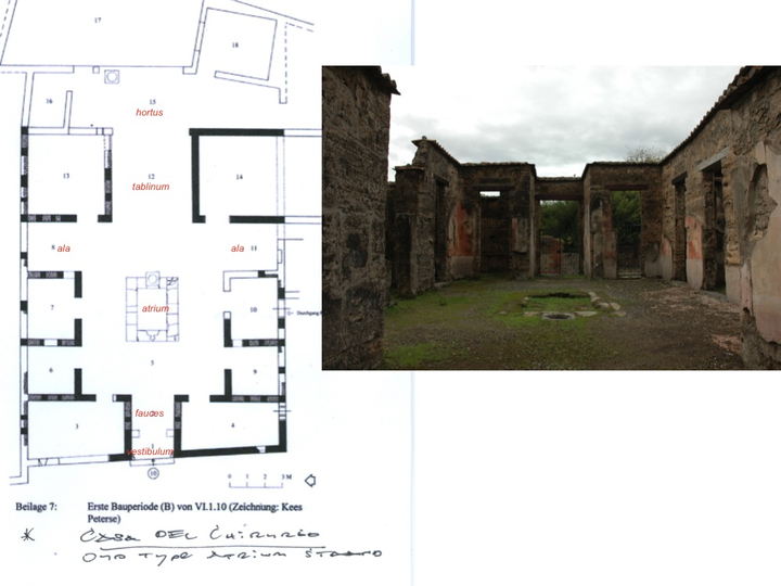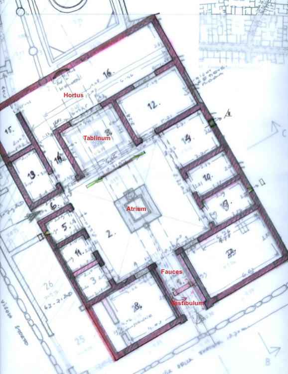 To me, the original central part of this house is an ideal shape of the classical atrium house because of its powerful axes and apparent symmetry. (This symmetry, from the vestibulum and fauces via atrium and tablinum to the hortus, is kept up by the passageway to the hortus through the presence of the andron, the row of cubicula on the left side of the atrium, where it is more narrow than on the right side. If there would be no andron, almost similar shaped cubicula would emerge to the left and right, but the atrium would no longer have the shape of a square.) The atrium is now almost a perfect square, circa 8.30 by 8.30 m. In short, the Casa della Caccia Antica has quite a smart floor plan; even though it has a symmetric longitudinal axis, it also has an asymmetric distribution of spaces. though it has a symmetric longitudinal axis, it also has an asymmetric distribution of spaces.