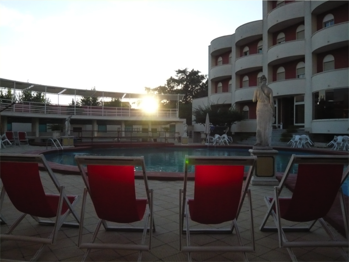 Hotel Villa dei Misteri is located on a backstreet, a stone’s throw away from the excavation site’s exit near the famous Villa dei Misteri in Pompeii. My hotel seems like the only paradisiacal residence in the rather indefinable surroundings; the neighborhood, apparently, is far from safe. The hotel was built around a swimming pool, and it vaguely reminds one of an expensive resort, albeit one that has not reached full glory yet. Built in the 1960s, its cement-colored look suggests it was never finished, even though the concrete was painted in the 1990s. At the same time, today’s visitors will readily accept its look as authentic: after all, antique statues we also like better uncolored; faded white marble has become an integral part of our cherished image of classical antiquity.