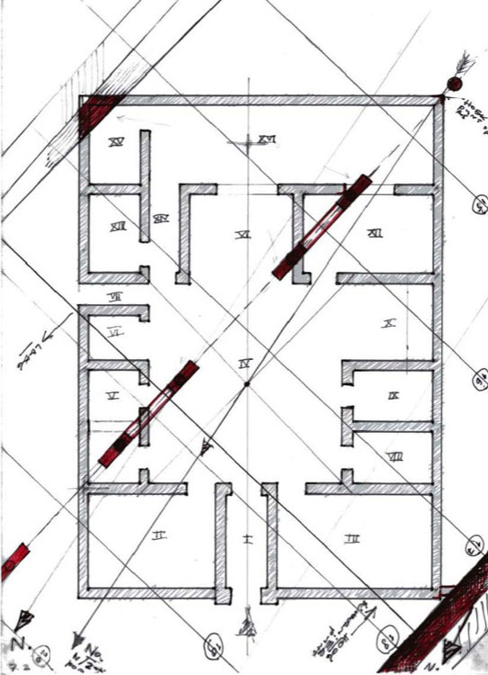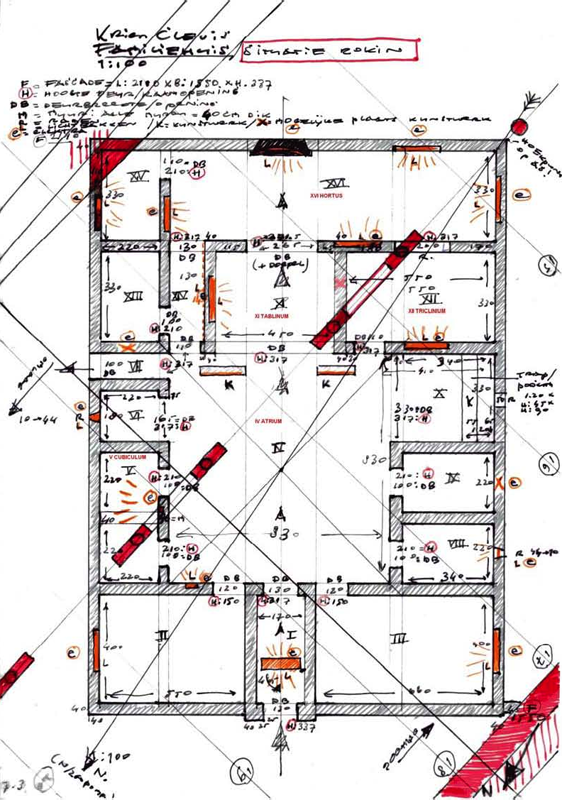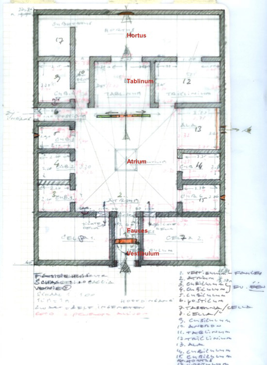 For my own design, I used the original building’s central part as starting-point. This implies that I left out from the original plan the later addition of the slave quarters on the east side and the peristylium and oecus on the south side, built in a 45 degrees angle toward the hortus. I concentrated on the spaces grouped around the atrium, which renders visible the axial-symmetric effect from the vestibulum up to the hortus. With my floor plan, as rationale, I return to the shape of an atypical house such as the Casa della Caccia Antica: a square atrium house.