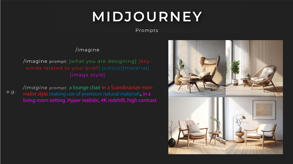 Example prompt: "a lounge chair in a Scandinavian minimalist style making use of premium natural materials, in a living room setting. Hyper realistic, 4K redshift, high contrast"