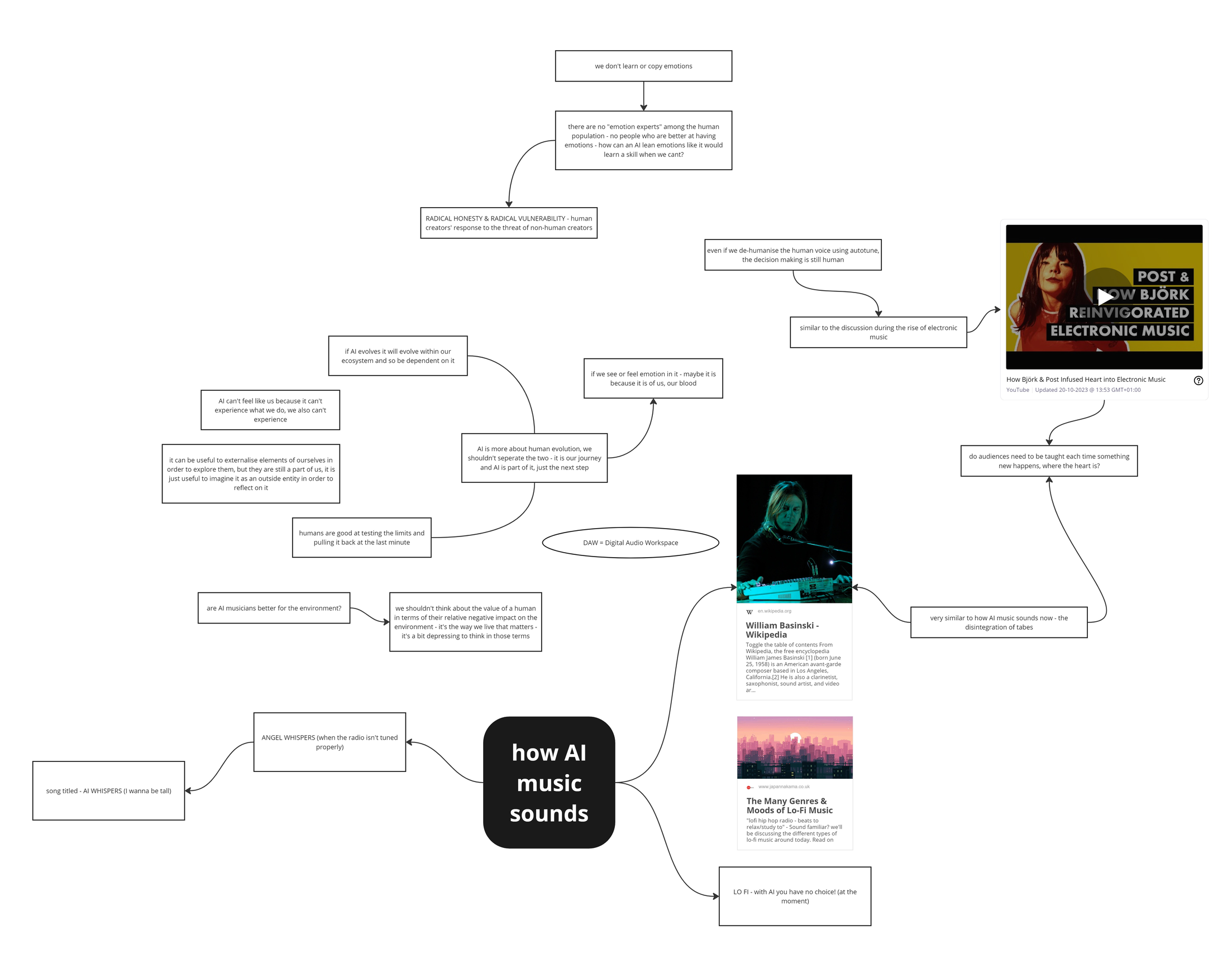 Saoirse then shared some examples of experimental computer and tape loop music, and discuss the role of the musician in bringing 'heart' and 'feeling' to compositions. You can see the discussions which arose from this mapped in the diagram below/right.