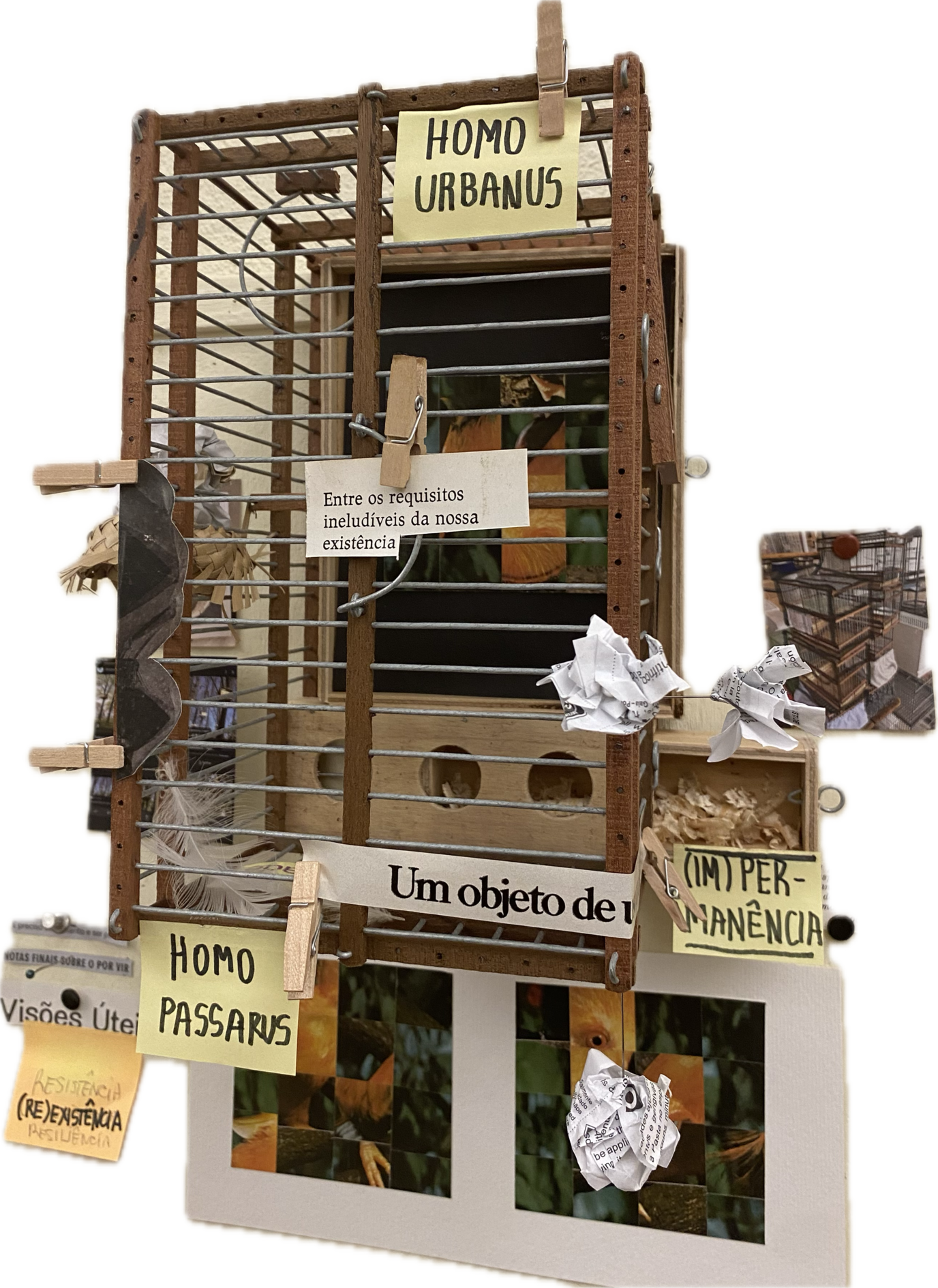 dipositivo objeto-instrumento de captação de ambiências sonoras, amplificador de corpos e territórios, ora objeto performativo, nasceu nas ruas da cidade, derivou da gaiola dos pássaros, se desenvolveu instrumento, andou, libertou... Em vias de extinção.