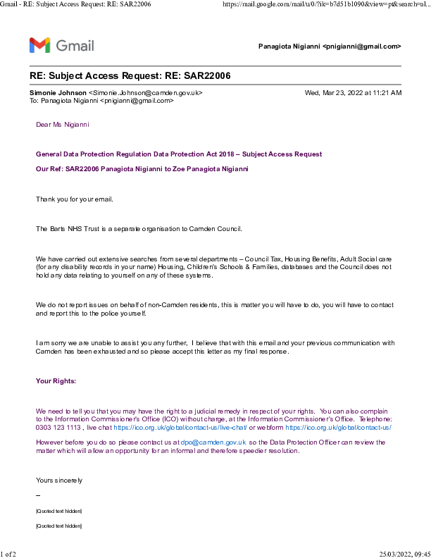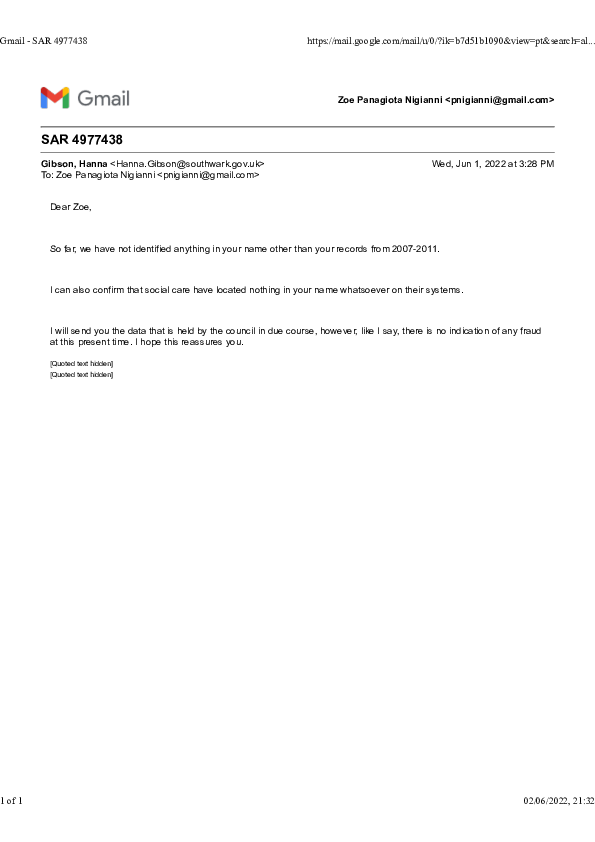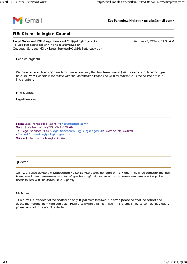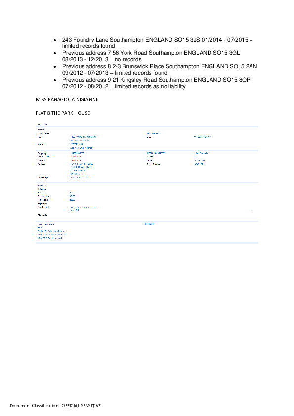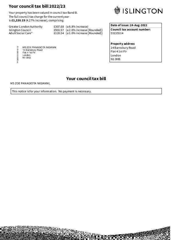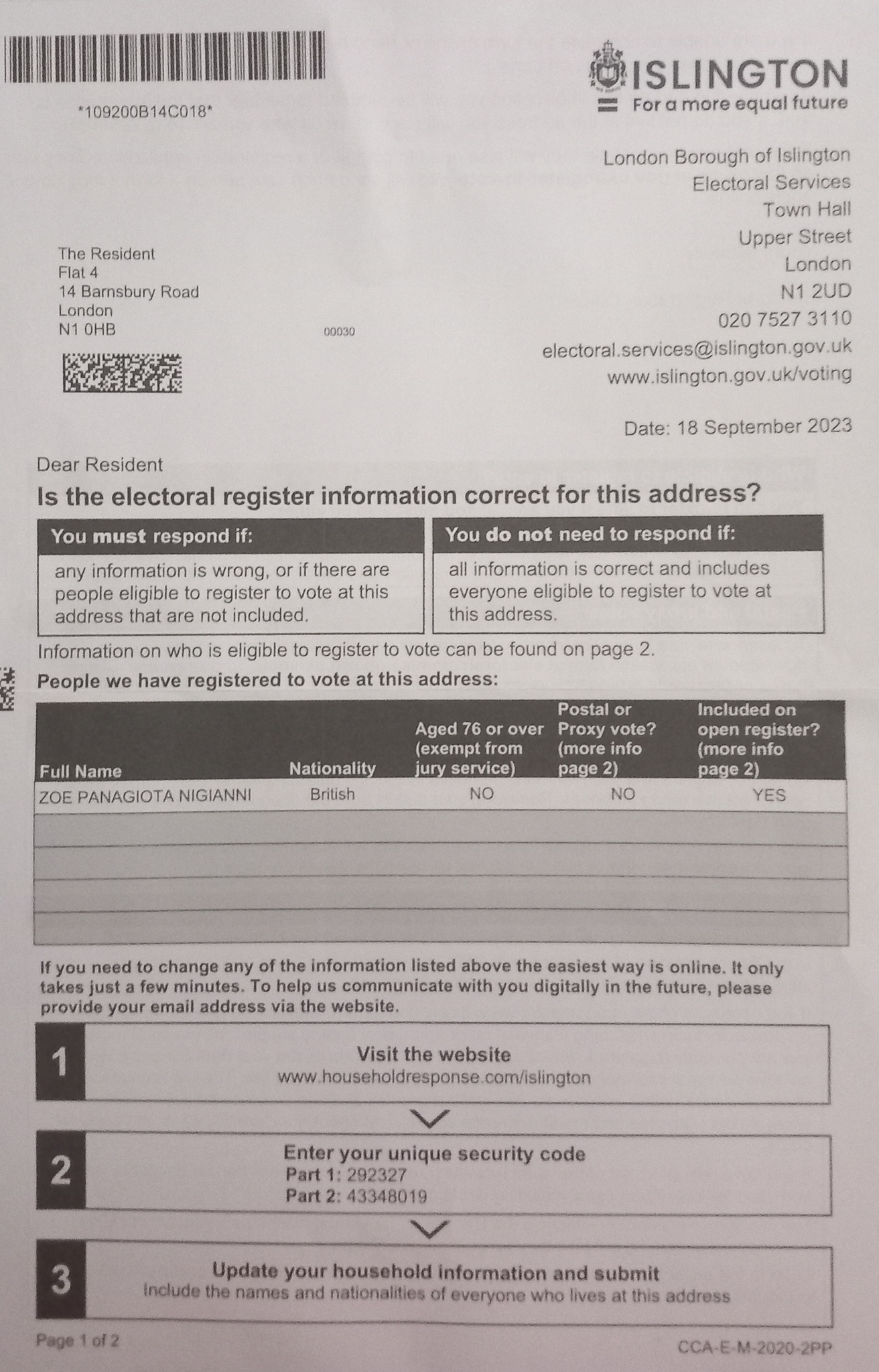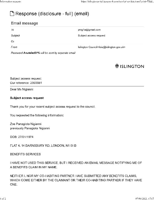 Documents relevant to Southwark, Islington and Southampton councils are uploaded below, showing the chronology of my whereabouts, since 2007 in the UK. They also show I was in Amsterdam in the summer of 2020, during Covid-19; I added the flights I took from Amsterdam with my British passport that summer, returning on 7 September 2020. Southampton was the last place I rented a property, before I left the UK, in 2015. The Southampton council tax shows I wasn't living there with children and I wasn't claiming disability benefits. Berns and Co. received references from the private estate agent, who rented me two apartments in Southampton, between 2012 and 2015; REFERENCES INCLUDED ABOVE. Southwark council also shows I didn't receive any walefare, including child benefit (EU nationals, who are parents, collect child benefit after they have been in the UK for a minimum of three years, while the same time frame applies to all welfare, including job seekers); or disability benefits, including illegal substances abuse (social care). They sent me some records related to Mr. Hladkyj, which he has, since we were living together. We were paying 500 UK pounds monthly rental for a spacious studio, next to Kennington Park and the underground, in a propety privately owned by two solicitors, Boyd and Hutchinson - I had started living in London full-time in 2005 and lived there until 2011. Finally, the Islington council tax and other documents show I lived in the Bellview property, without children (-17 years old), from AUTUMN 2020 (joint with Mr. Hladkyj, until May 2022, for two tenants; from May 2022, as a sole tenant) until MARCH 2024, as well as that I wasn't claiming disability benefits. There is no other information about myself in Islington, where I lived before I left the UK in March 2024, besides my registration at the electoral; I voted at the 2021 mayoral elections for Sadiq Khan, like I voted in the 2015 national elections, when I was living in Southampton for the then Labour candidate, Ed Milliband. There is no other information about myself in Southampton, where I only lived between 2012 and 2015, where I was also registered at the electoral and voted in the general elections 2015. There is NO information about myself in Hackney, Camden (explicitely stating no social care in any name of mine), or Haringey councils, where I have never lived: this includes any benefits claims, as mentioned in the correspondence from those councils in any of my legal names (Panagiota to Zoe Panagiota Nigianni). No one can claim without ID in their name and any tax or other credits from welfare show in someone's council tax records. Council tax is calculated based on how many people live in the property and ALL ADULTS ARE SHOWN ON THE COUNCIL TAX WITH THEIR NAMES; in this case myself and Mr. Hladkyj, without children (no tax credits). There is NO record of mine in the UK since March 2024. I conducted ALL THE SARs with my old British passport and my current British passport, renewed in April 2021, bearing my legal name change from Panagiota to Zoe Panagiota, as shown in some of the SAR responses. The address for Islington council is 222 Upper Street, Islington.