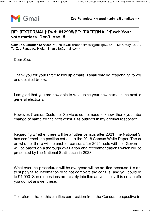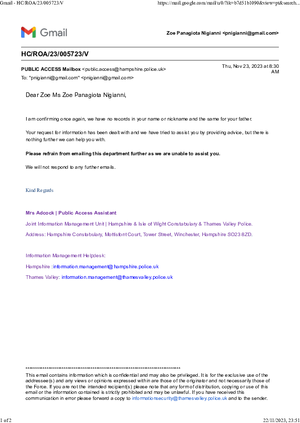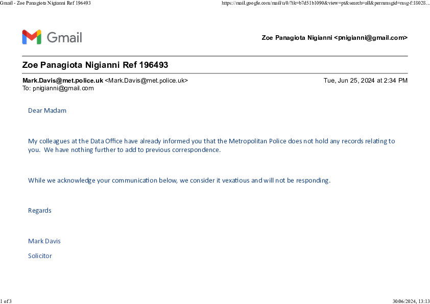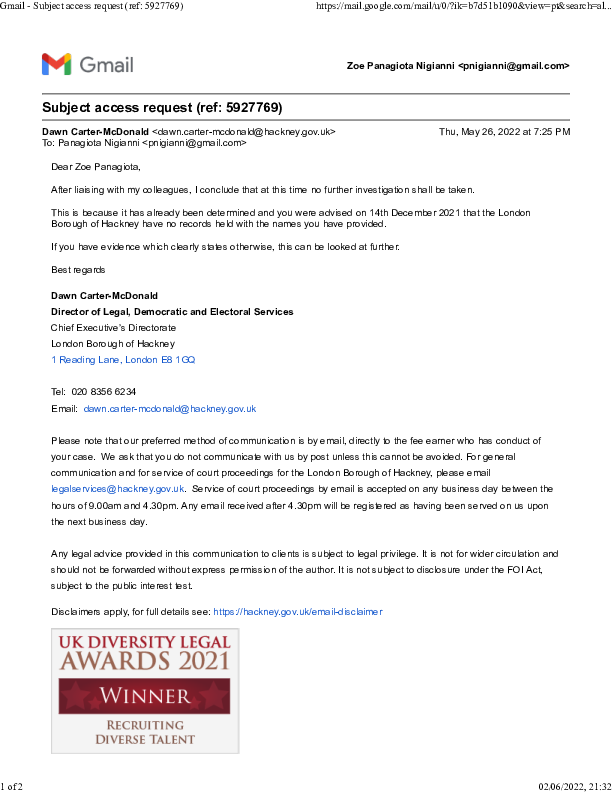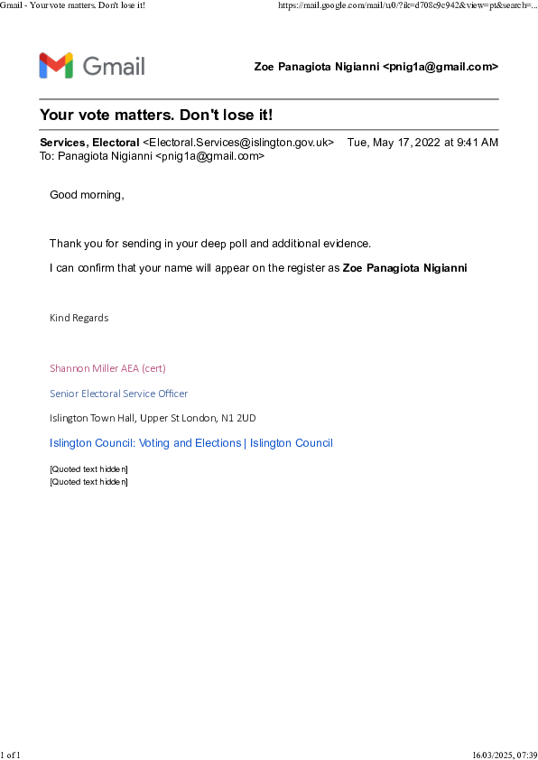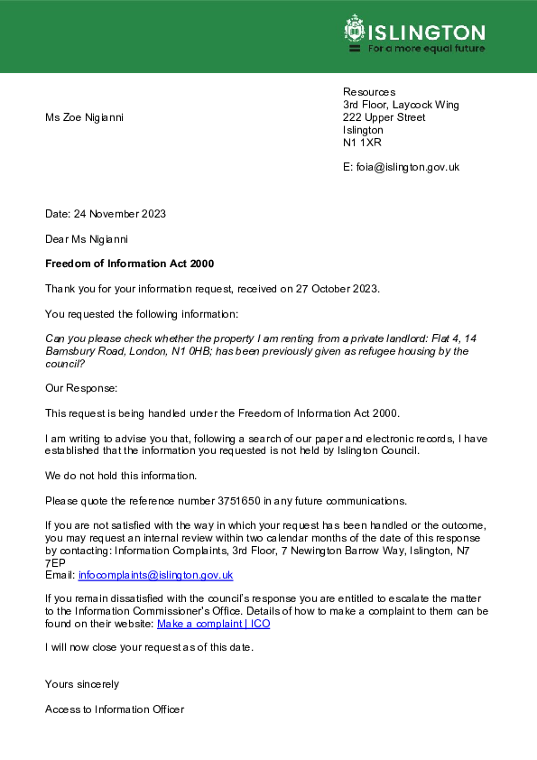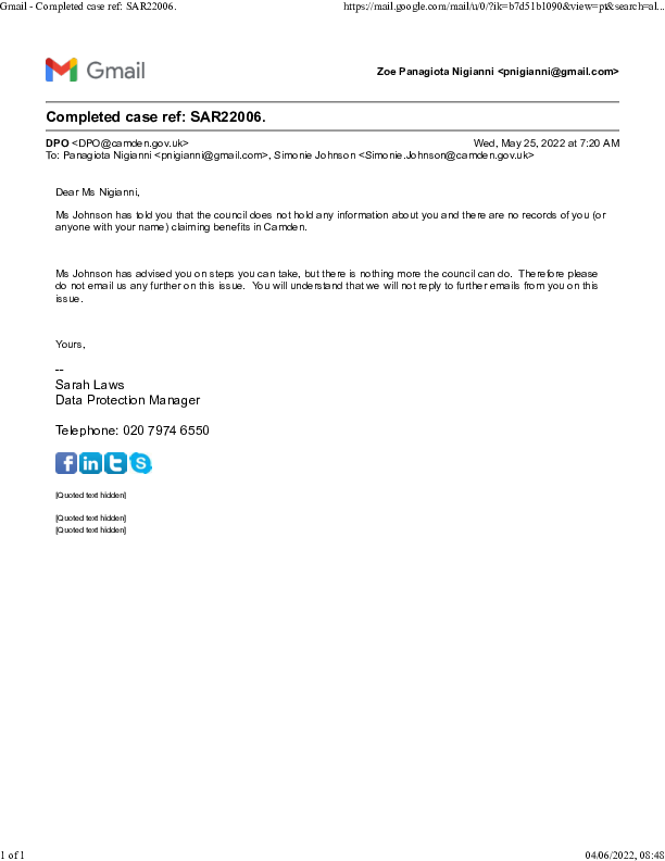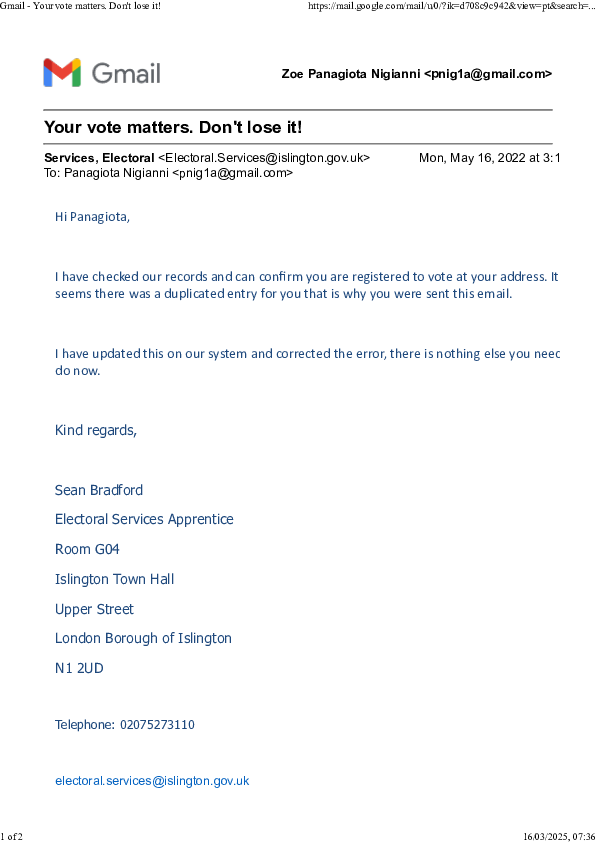Documents relevant to Southwark, Islington and Southampton councils are uploaded below, showing the chronology of my whereabouts, since 2007 in the UK. They also show I was in Amsterdam in the summer of 2020, during Covid-19; I added the flights I took from Amsterdam with my British passport that summer, returning on 7 September 2020. Southampton was the last place I rented a property, before I left the UK, in 2015. The Southampton council tax shows I wasn't living there with children and I wasn't claiming disability benefits. Berns and Co. received references from the private estate agent, who rented me two apartments in Southampton, between 2012 and 2015; REFERENCES INCLUDED ABOVE. Southwark council also shows I didn't receive any walefare, including child benefit (EU nationals, who are parents, collect child benefit after they have been in the UK for a minimum of three years, while the same time frame applies to all welfare, including job seekers); or disability benefits, including illegal substances abuse (social care). They sent me some records related to Mr. Hladkyj, which he has, since we were living together. We were paying 500 UK pounds monthly rental for a spacious studio, next to Kennington Park and the underground, in a propety privately owned by two solicitors, Boyd and Hutchinson - I had started living in London full-time in 2005 and lived there until 2011. Finally, the Islington council tax and other documents show I lived in the Bellview property, without children (-17 years old), from AUTUMN 2020 (joint with Mr. Hladkyj, until May 2022, for two tenants; from May 2022, as a sole tenant) until MARCH 2024, as well as that I wasn't claiming disability benefits. There is no other information about myself in Islington, where I lived before I left the UK in March 2024, besides my registration at the electoral; I voted at the 2021 mayoral elections for Sadiq Khan, like I voted in the 2015 national elections, when I was living in Southampton for the then Labour candidate, Ed Milliband. There is no other information about myself in Southampton, where I only lived between 2012 and 2015, where I was also registered at the electoral and voted in the general elections 2015. There is NO information about myself in Hackney, Camden (explicitely stating no social care in any name of mine), or Haringey councils, where I have never lived: this includes any benefits claims, as mentioned in the correspondence from those councils in any of my legal names (Panagiota to Zoe Panagiota Nigianni). No one can claim without ID in their name and any tax or other credits from welfare show in someone's council tax records. Council tax is calculated based on how many people live in the property and ALL ADULTS ARE SHOWN ON THE COUNCIL TAX WITH THEIR NAMES; in this case myself and Mr. Hladkyj, without children (no tax credits). There is NO record of mine in the UK since March 2024. I conducted ALL THE SARs with my old British passport and my current British passport, renewed in April 2021, bearing my legal name change from Panagiota to Zoe Panagiota, as shown in some of the SAR responses. The address for Islington council is 222 Upper Street, Islington.