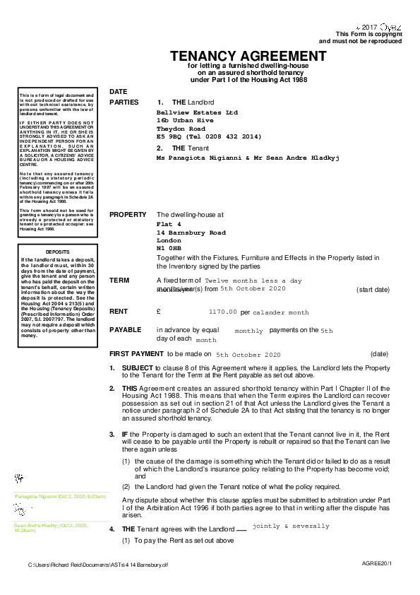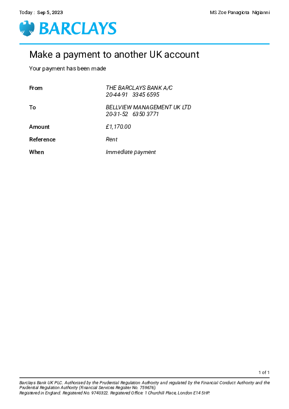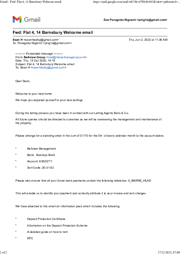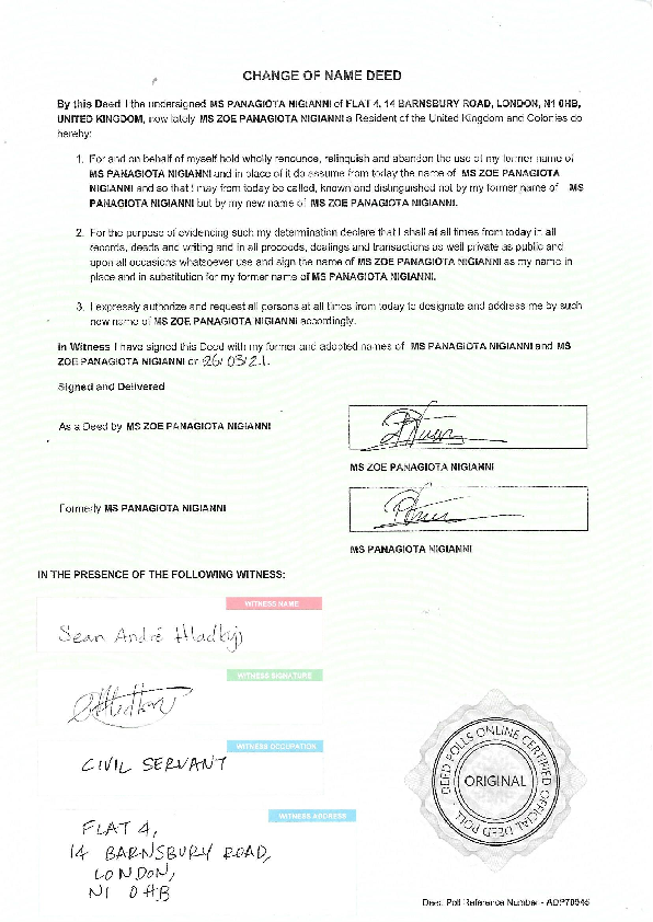 I issued my first British passport in my legal name at birth, Panagiota Nigianni, in 2012. When I renewed it in 2021, I changed my name legally via deed poll for British nationals, by adding a second first name to my legal first name at birth: from Panagiota to Zoe Panagiota. The rental contract was prepared with my first British passport, as well as Mr Hladkyj's British passport, in October 2020, by the estates agent, Berns & Co.