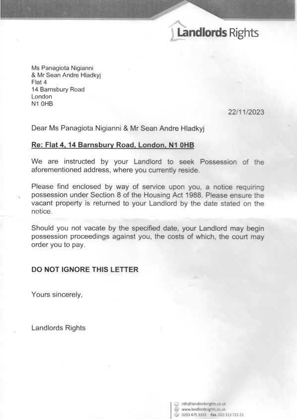 Fake letter not received through the post in my legal name at birth, which is for females, changed legally in 2021 via deed poll for British nationals, from Panagiota to Zoe Panagiota Nigianni. The fake letter mentions other occupants and orders everyone to leave. I was the only occupant of the rental property, from May 2022, when my former co-habiting partner, Mr. Hladkyj, a British native, left, and until the date on the letter. It seems that "other occupants" might have moved in shortly after I was forced to leave, without a final courts decision, which should have been in my legal name, changed legally in April 2021, Zoe Panagiota Nigianni. My council tax closure on 27 March, 2024. Anyone who might have moved in after that date, would be obviously connected with the property owners, through one of the shareholders or landlords, and they wouldn't be paying rent, like I was, on my own, and previously, from 5 October 2020, as the signed rental contract shows, with Mr Hladkyj. If anyone had moved into the rental property, after I was forced to leave on 27 March 2024, that would be the offsprings of someone who is connected with the landlords and they wouldn't be paying rent.