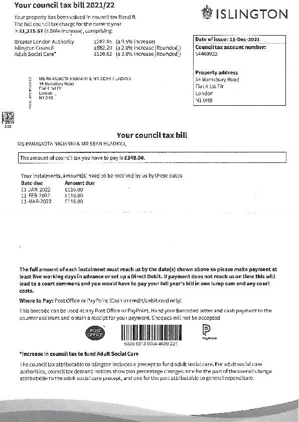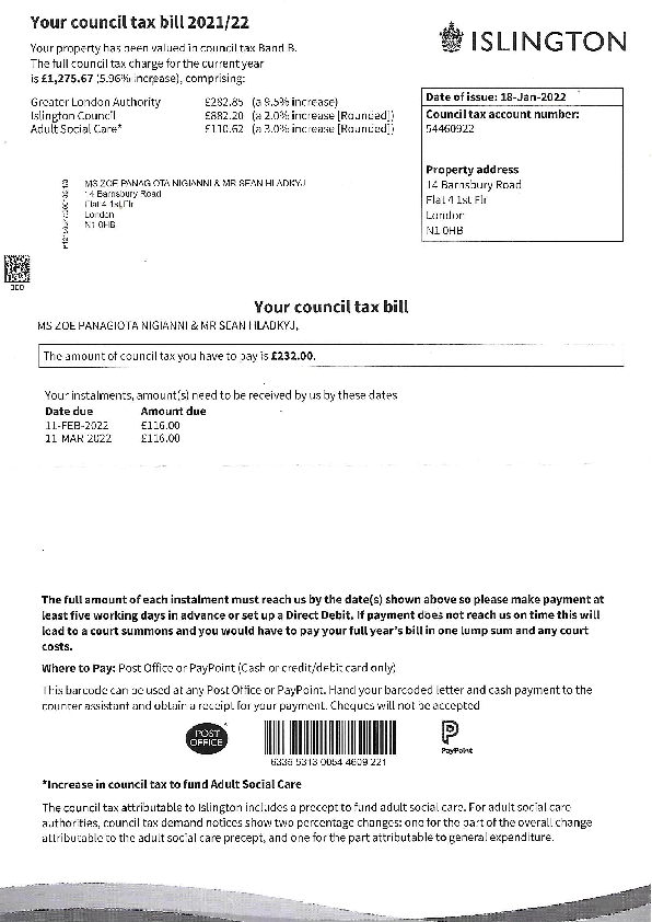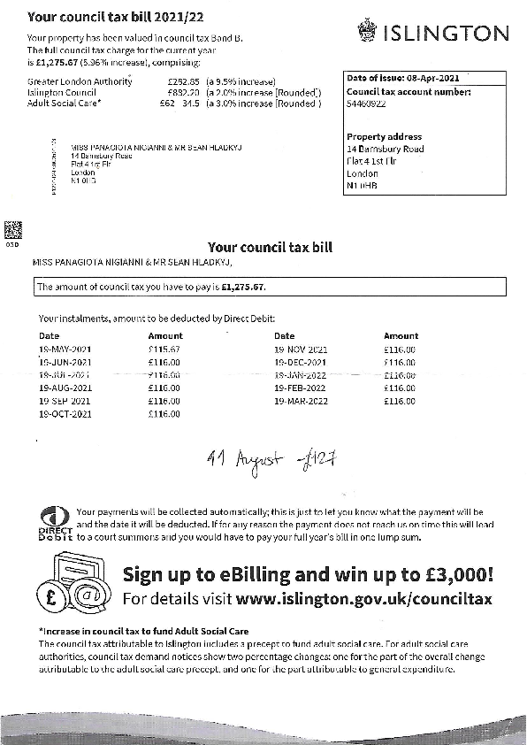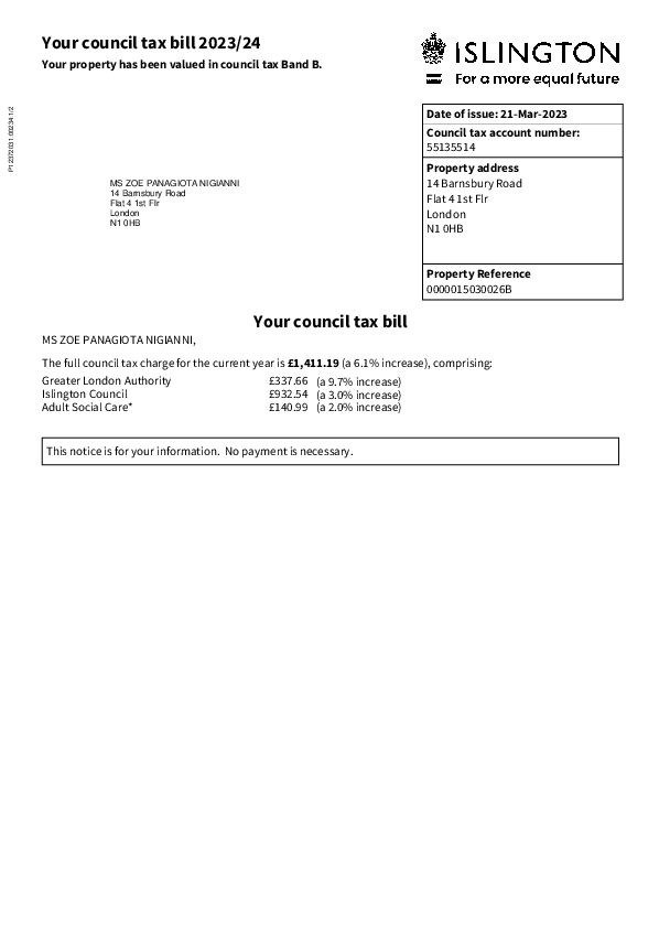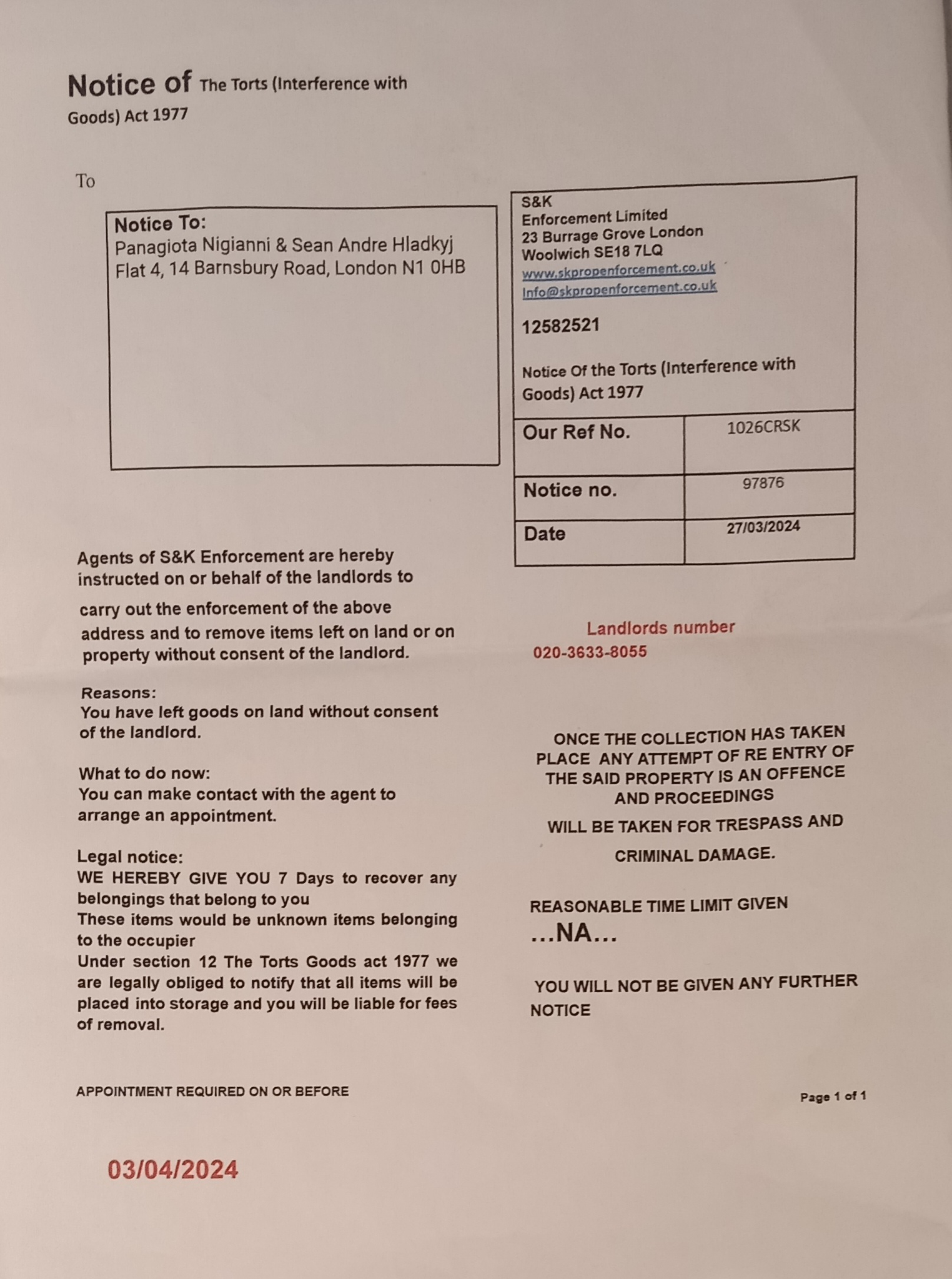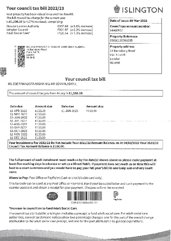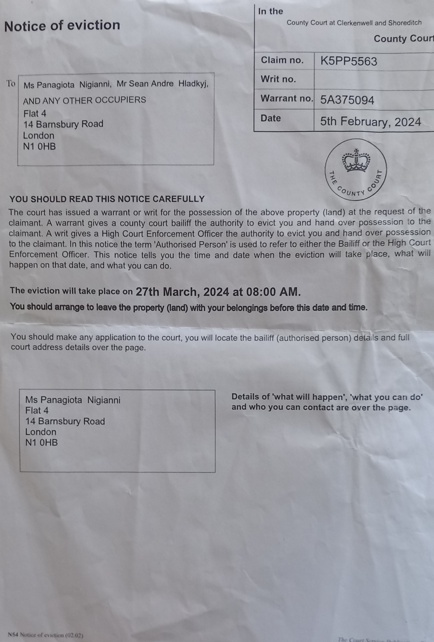 All my art materials (from pencils and coloured pencils, charcoals, pastels, watercolours, gouache, oils and acrylics, epoxy raisin and various tools, besides paint brushes) and an over a decade's collection of expensive art books I also used to teach; notably a few Shakespeare plays, too, 'Macbeth', 'Othello', 'Romeo and Juliette' that I didn't use to teach, since I never taught drama, which I bought to enrich my English vocabulary and became fascinated - any resemblances of the actors to actual people are accidental - were stolen. Moreover, whatever personal belongings of mine I couldn't take with me in the one hour I was given by bailiffs (Sent by who? The illegal landlords. Thornberry, the Angel MP? Bailiffs are NOT police officers), who showed up on my door step with the above documents, were lost: including clothes, shoes, cosmetics, furnishings, kitchenware, as well as my art put up on the walls and an old portfolio of mine, along with Sean's design portfolio and a few of his personal belongings that he had left behind and I had packed for him to take. My personal belongings were stolen by thugs, who ignorant and equally thuggish people glorified globally to start with - not anymore. They put a new lock on the door and changed the key. They asked me to collect my personal belongings from a Woolwich storage. That seeemed suspicious to me and I was right: neighbours told me my personal belongings were still in the property for a couple of months, after the bailiffs showed up at my doorstep. Names of property management: Ben Binet, Bernard Helipern, Aron Warfman: pseudonyms. I called the police, who came and took notes. I told them I'm an artist and activist and that my artistic name is Betty Nigianni. That was on 27 March 2024. My council tax closed on 27 March, that same day. I haven't been able to return to London or the UK since, due to counterfeit, with an offender's profile, which I believe are connected with the property. People who live in the UK pay council tax to the council they live, regardless of whether they are tenants, or owners of the property. Council tax covers the council's expenses towards occupants of any property and is calculated based on the amount of people, who occupy any property. Different councils have different council tax bands.