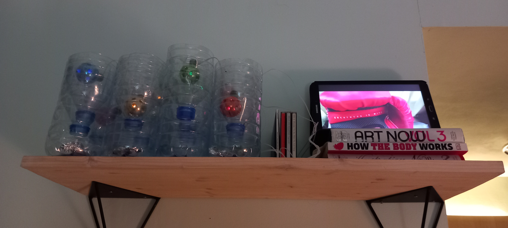 Above: Improvised light design, made of recycled plastic bottles and a led light, with a screened digital photograph, featuring the message "Greatness Lies Within".