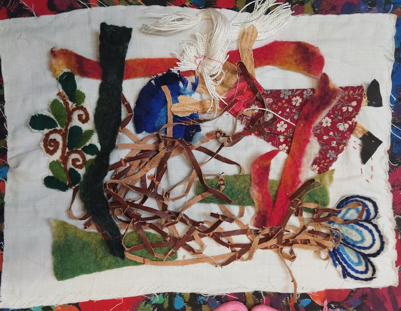 The textures and colours represent the inter mingling of humans with all forms of non human life on earth including air, plants, water and rocks. Indigenous forms of knowledge which equate caring for earth as caring for self can enrich our direction towards sustainable futures.